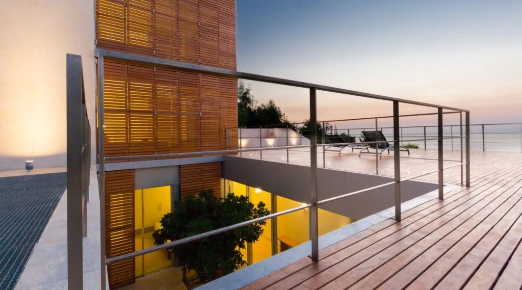 Una vez protegida esta zona, la esquina noroeste de la torre se dejó libre de paredes, cerrándose por medio de ventanales de suelo a techo. Deslizando estos y plegando por completo las contraventanas de madera, los dormitorios se transforman en espectaculares balcones al mar.