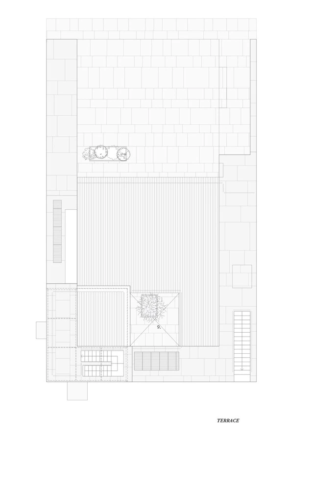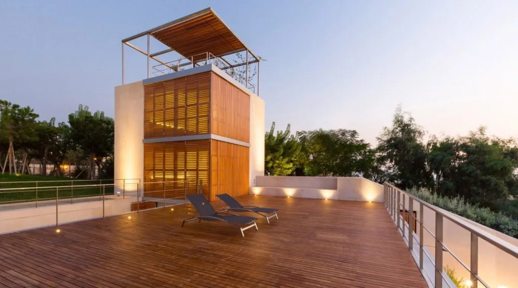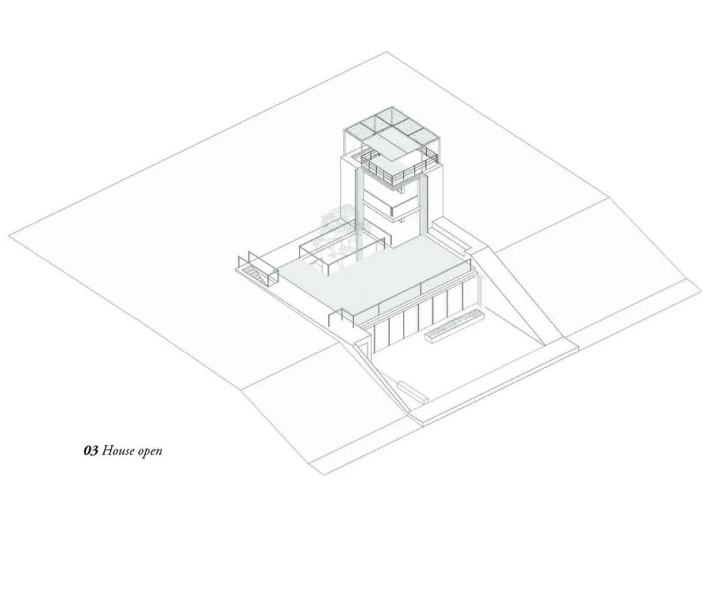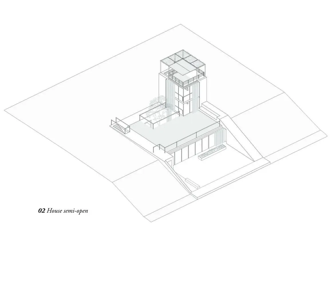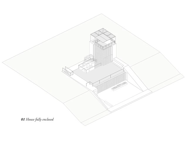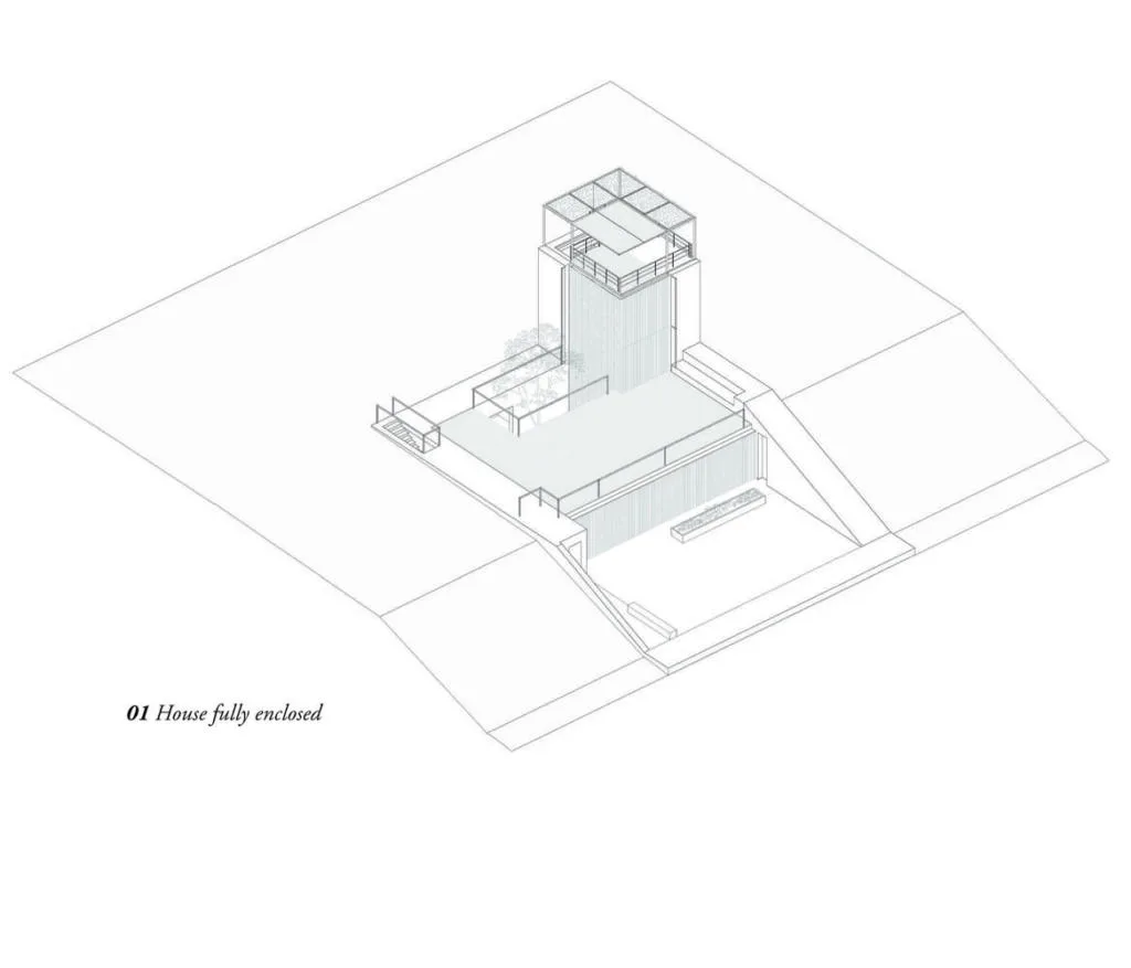 Otro de los aspectos más llamativos de este proyecto es la disposición de los dormitorios en forma de torre, que culmina en una terraza. Al estar en el lado sureste del patio de entrada, asegura muchas horas de sombra. Además, libera el calor de los dormitorios y el patio a modo de chimenea. Por otra parte, los baños y la escalera en el lado sur y este actúan como frontera térmica, evitando un sobrecalentamiento de las áreas de descanso en verano.