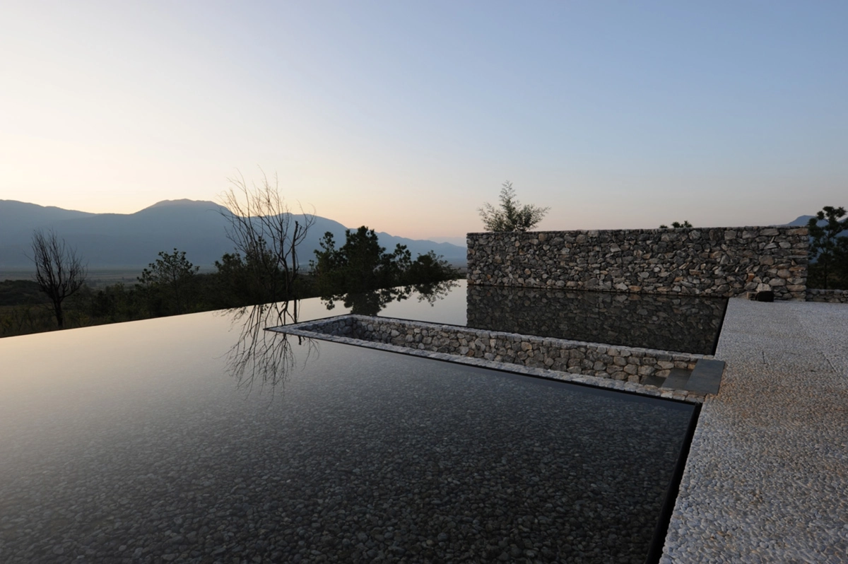 La vivienda sintetiza las formas y técnicas tradicionales para dar vida a un edificio moderno y contemporáneo que resuene con el lugar, la historia y la naturaleza circundante. Concebida como una sucesión de patios interiores interconectados, la casa tiene un patio abierto aunque cerrado en el sentido de que es seguro y está separado, físicamente, del mundo exterior a través de elementos tales como un muro de piedra, la piscina y la nivelación; pero está abierta visualmente hacia el entorno exterior.