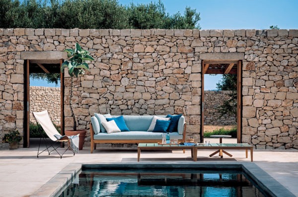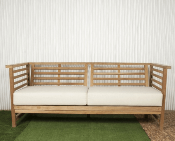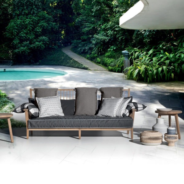 Destacamos el sofá exterior Verora de dos plazas, realizado en madera de teca maciza y en color crema. En cuanto a la colección BAT, un sofá exterior de 3 plazas de madera de teca y cuyos reposabrazos están a la misma altura que el extremo superior de los respaldos, consiguiendo así un diseño más cerrado. También de la colección BAT, un sofá exterior de 2 plazas que sigue el mismo diseño que el anterior.