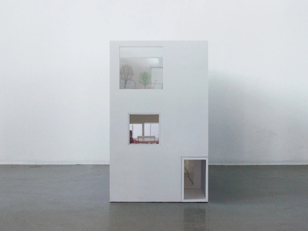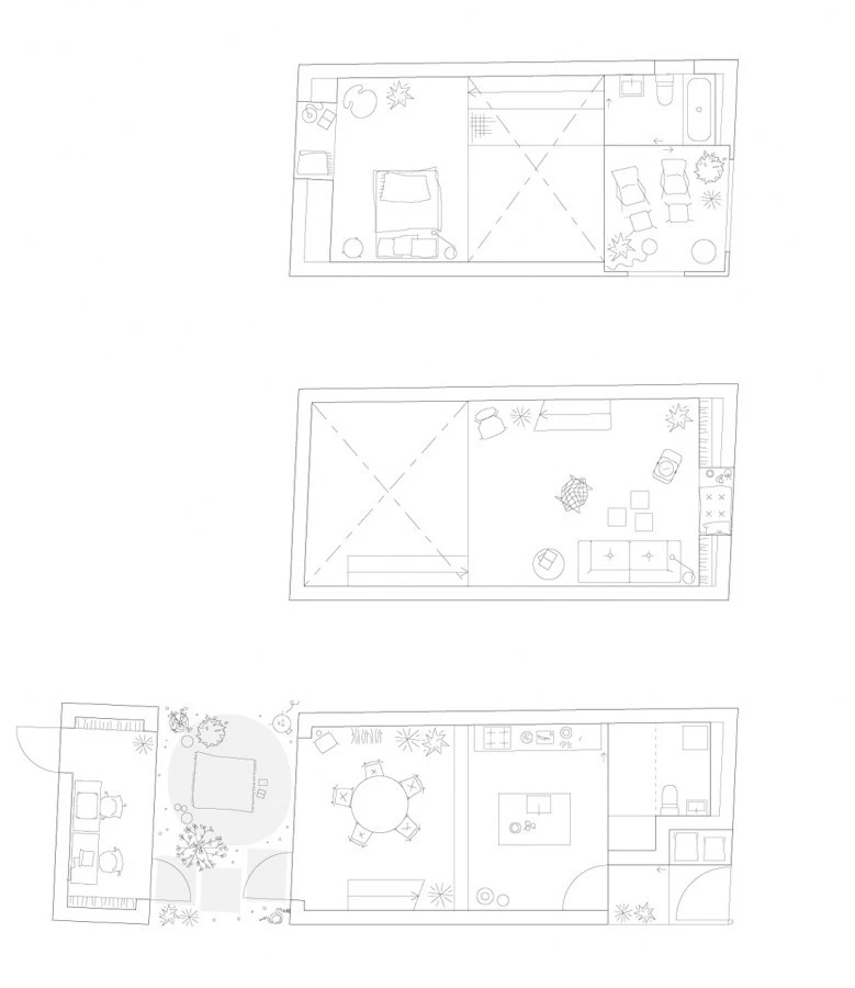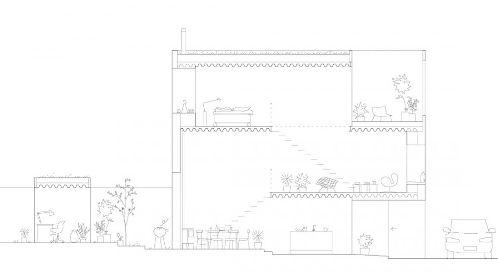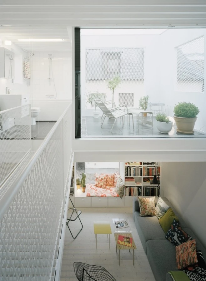 Con una estructura en tres alturas, el interior consta de un solo espacio, dividido por tres placas de acero expuesto. Estos compartimentos abarcan toda la anchura de la casa, que consta de cocina, sala de estar, comedor, dormitorio, baño y biblioteca, para rematar con una terraza en la azotea. En el patio trasero se ubicó un espacio diferenciado con una pequeña oficina acristalada que hace las veces de local para el negocio de arte de uno de los propietarios.