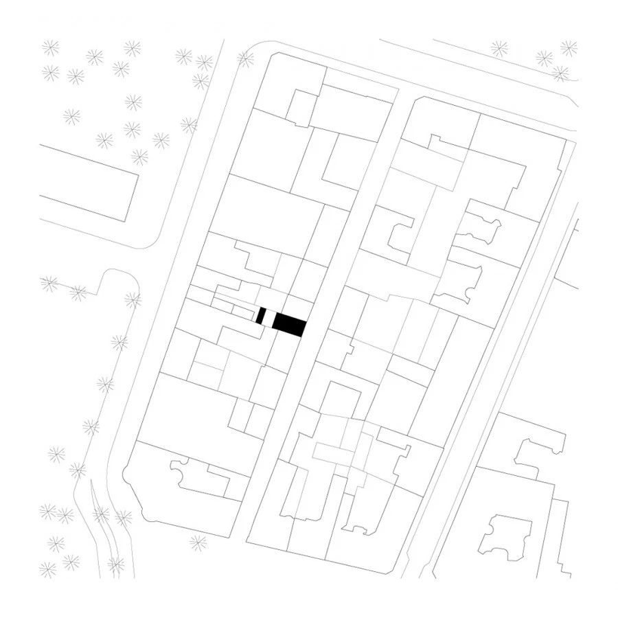 Esta llamativa construcción en tres niveles –de un blanco impoluto– ocupa una estrecha parcela que llevaba sin uso desde mediados del siglo pasado. Los edificios contiguos son bajos, por lo que su fachada despunta notablemente sobre ellos. Sin embargo, el resto de viviendas de la calle alterna distintas alturas y materiales. En cuanto a los patios traseros, todos cuentan con muros de ladrillo, cobertizos y un pequeño jardín.