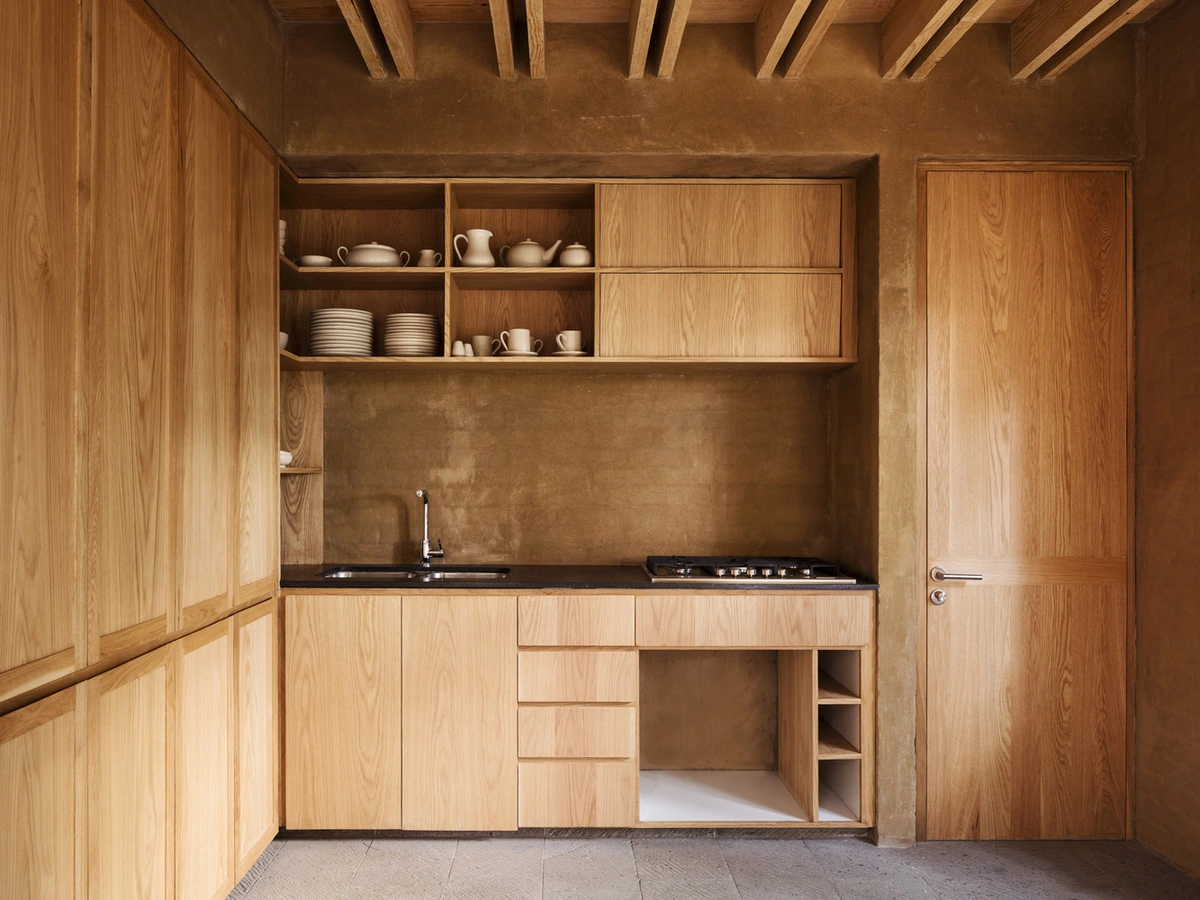 El espléndido uso del ladrillo en muros interiores y exteriores, enlucidos con la misma tierra de las excavaciones; la madera empleada en la carpintería, en los techos y en el mobiliario parece sacada de los pinos que rodean el solar; los suelos de cerámica, los patios interiores en piedra y los caminos de acceso de tierra se funden perfectamente con el suelo rústico del entorno.