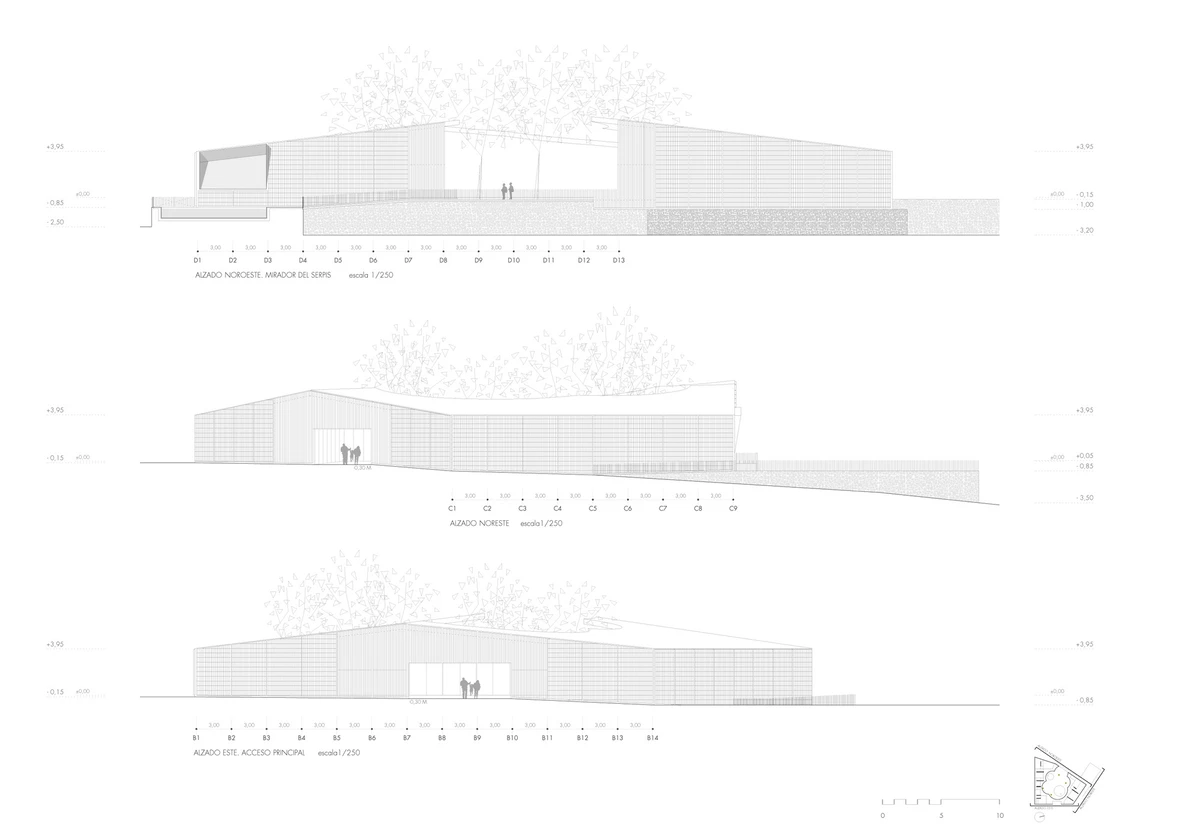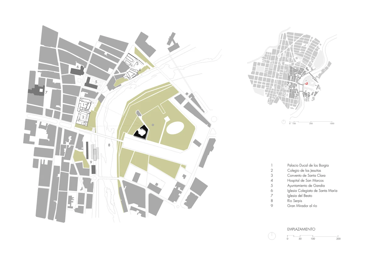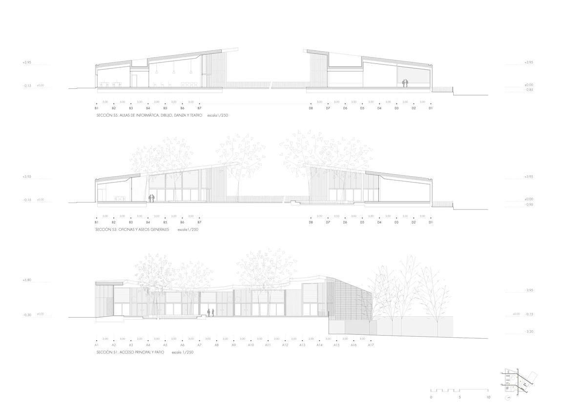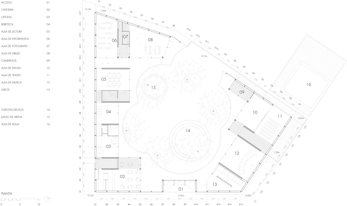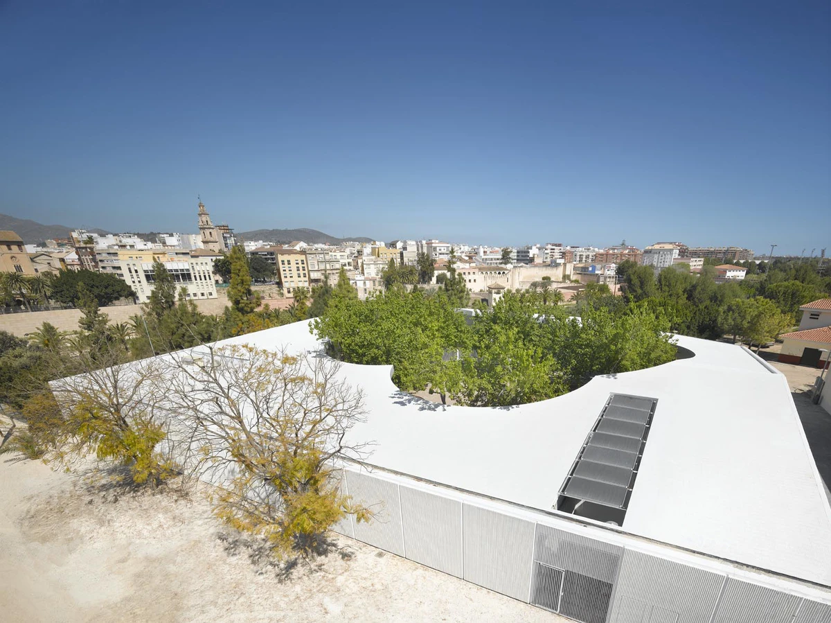 Cada espacio interior se dedica a una actividad: pintura, fotografía, lectura, informática, música, danza… Las instalaciones se completan con una sala para bebés, un teatro cubierto, una cafetería y unas vistas excelentes al río Serpis. Además, se transformó un antiguo estanque anexo al edificio en una piscina para el verano.