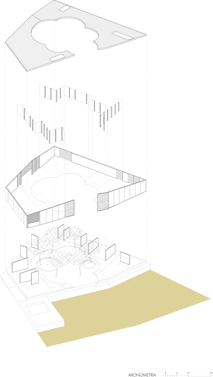 El proyecto se adjudicó al estudio madrileño Paredes Pedrosa Arquitectos, que apostó por una construcción trapezoidal de una sola planta para englobar las seis grandes moreras ya existentes. Este diseño crea así un gran patio central de convivencia en forma de nube que incluye un arenero y una grada para cuentacuentos al aire libre. El propio arbolado genera las zonas de sombra y tamiza la luz natural que inunda las aulas acristaladas.