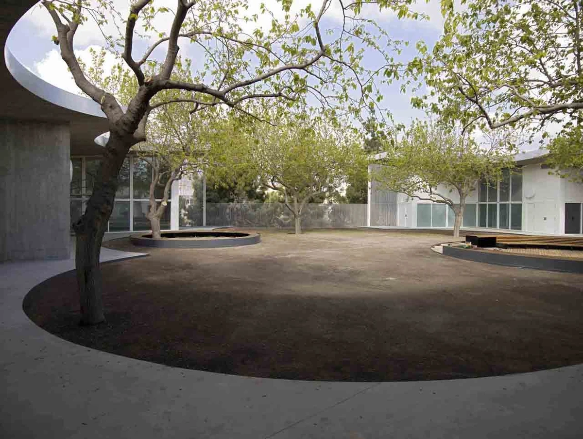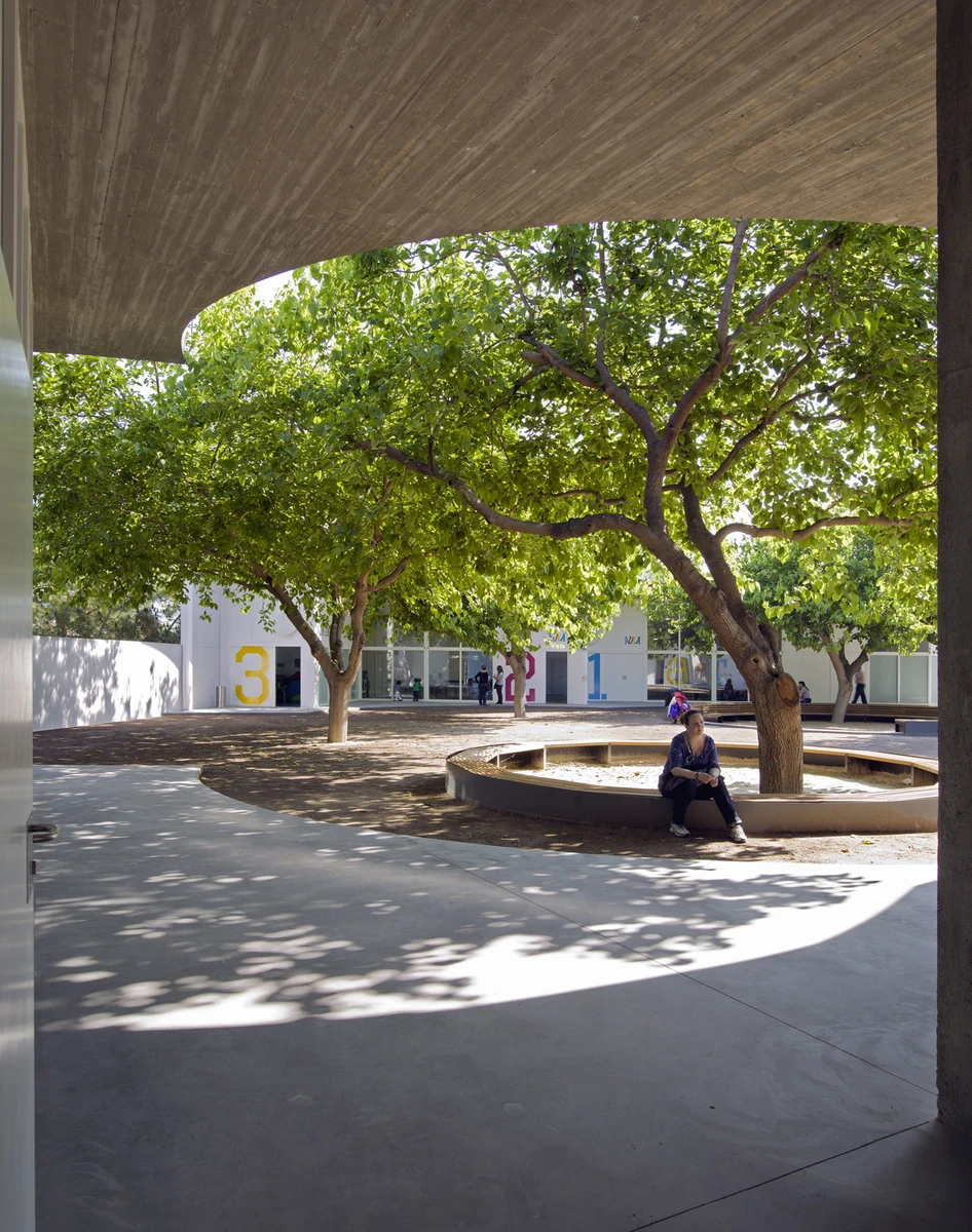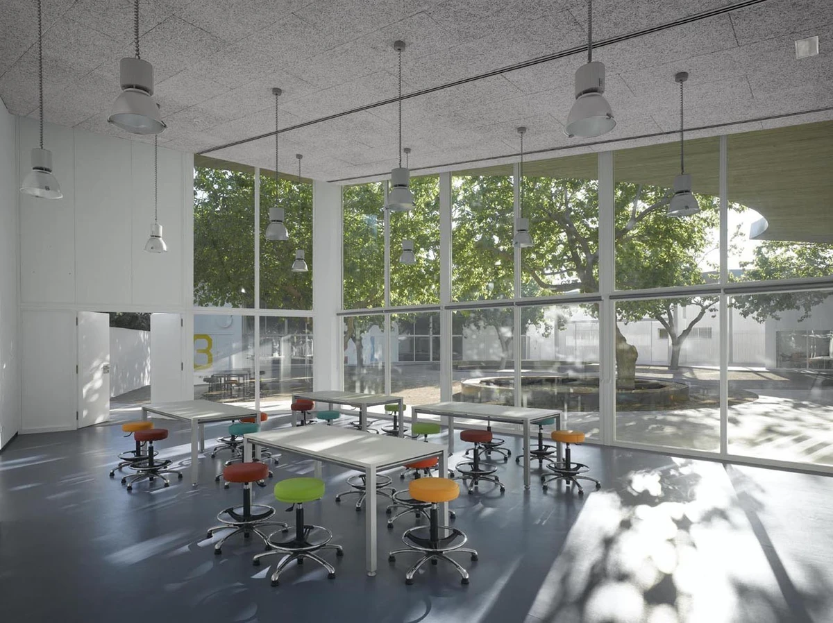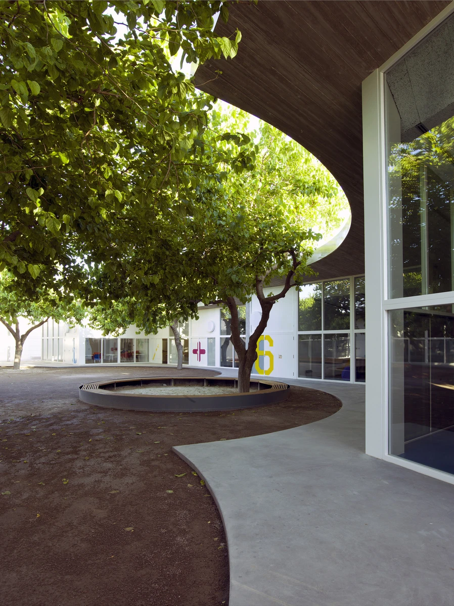 La forma escogida para la cerámica del perímetro crea una envolvente ondulada muy atractiva que recuerda a una valla de bambú. La blancura de este espacio tiene su continuidad en el patio, donde la carpintería se pintó del mismo color. Este nexo visual, unido a la transparencia de las grandes cristaleras, contribuye a la integración del edificio en el parque, ya que las moreras se pueden ver desde todas las aulas.
