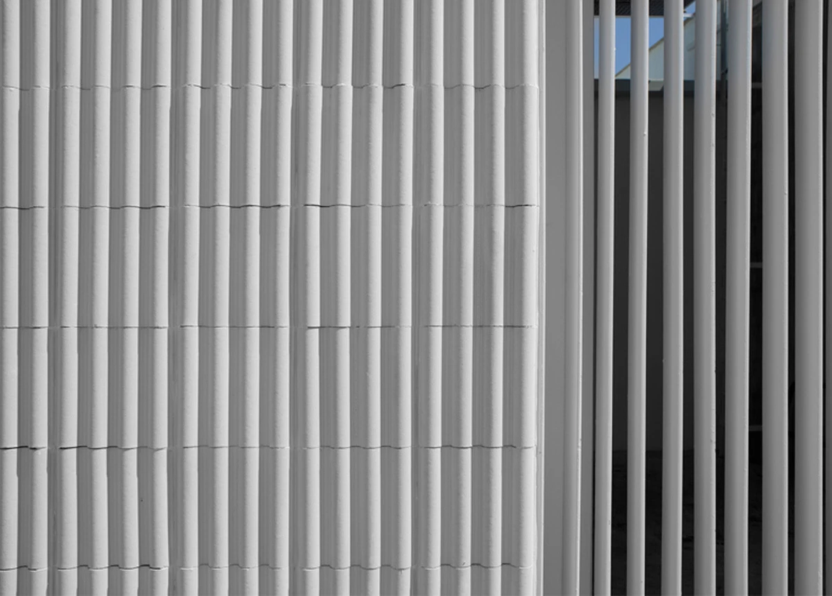 En cuanto a las fachadas exteriores y el tejado, se eligió un revestimiento de cerámica blanca, elemento tradicional de esta área mediterránea. Resulta muy práctico porque no requiere mantenimiento y se adapta muy bien al clima templado, reflejando el calor en verano. A su vez, la cubierta se inclinó ligeramente desde el centro para evitar que el agua de lluvia caiga hacia el patio lobulado.