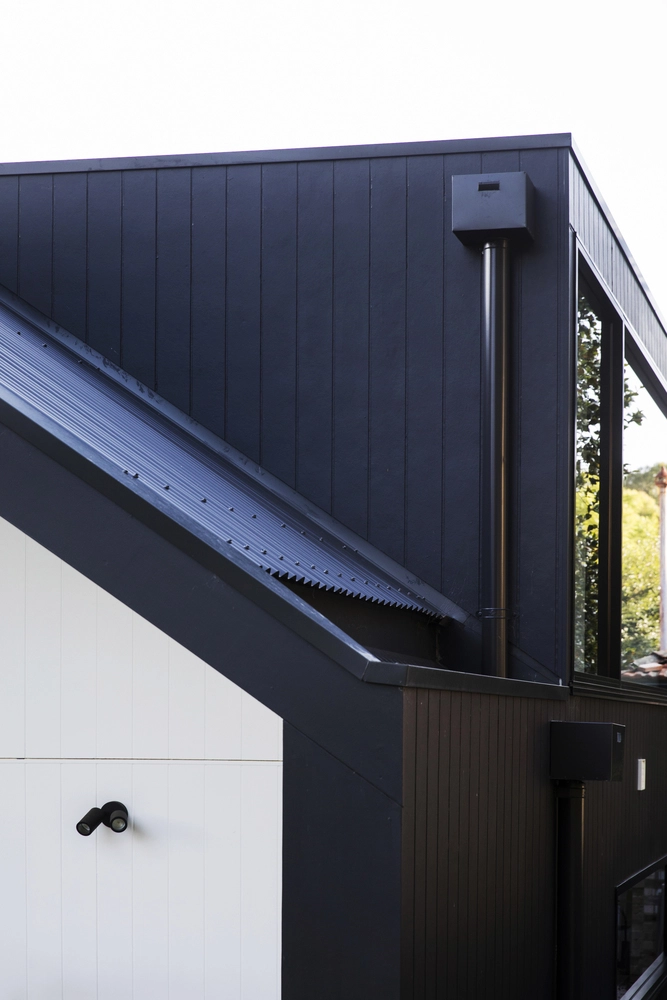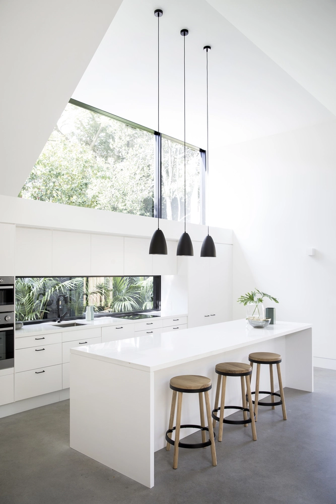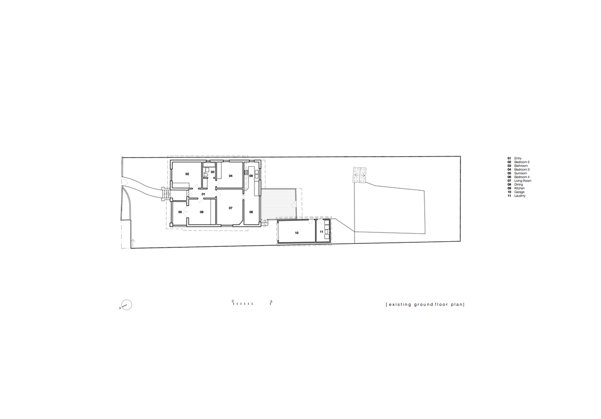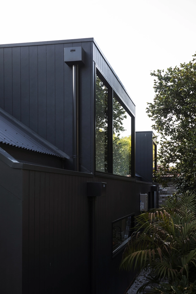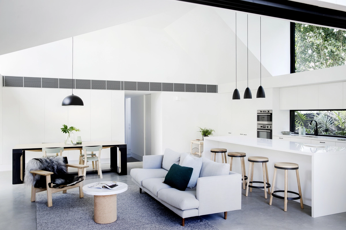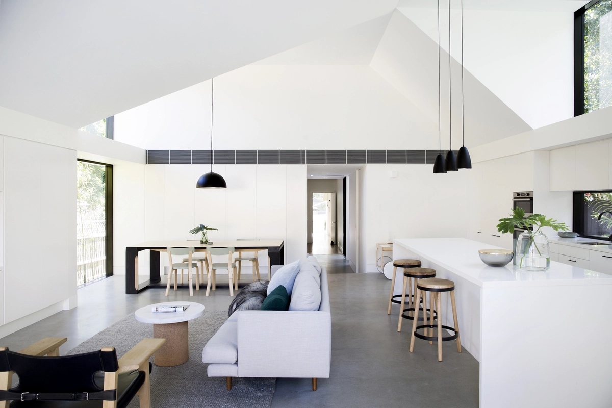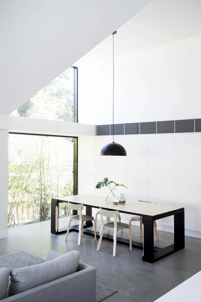 La ampliación se realizó sobre una casa de los años 30 situada en Lane Cove, un barrio próximo al centro de Sídney. En lugar de reproducir la estética del edificio a reformar, con su fachada de ladrillo pintada de blanco, se decidió dar un aire absolutamente contemporáneo al espacio añadido. Desde luego, la solución no puede ser más transgresora: una estructura de cobertizo abierto hacia la parte trasera donde una mezcla de tejados horizontales y a dos aguas garantiza una iluminación natural abundante.