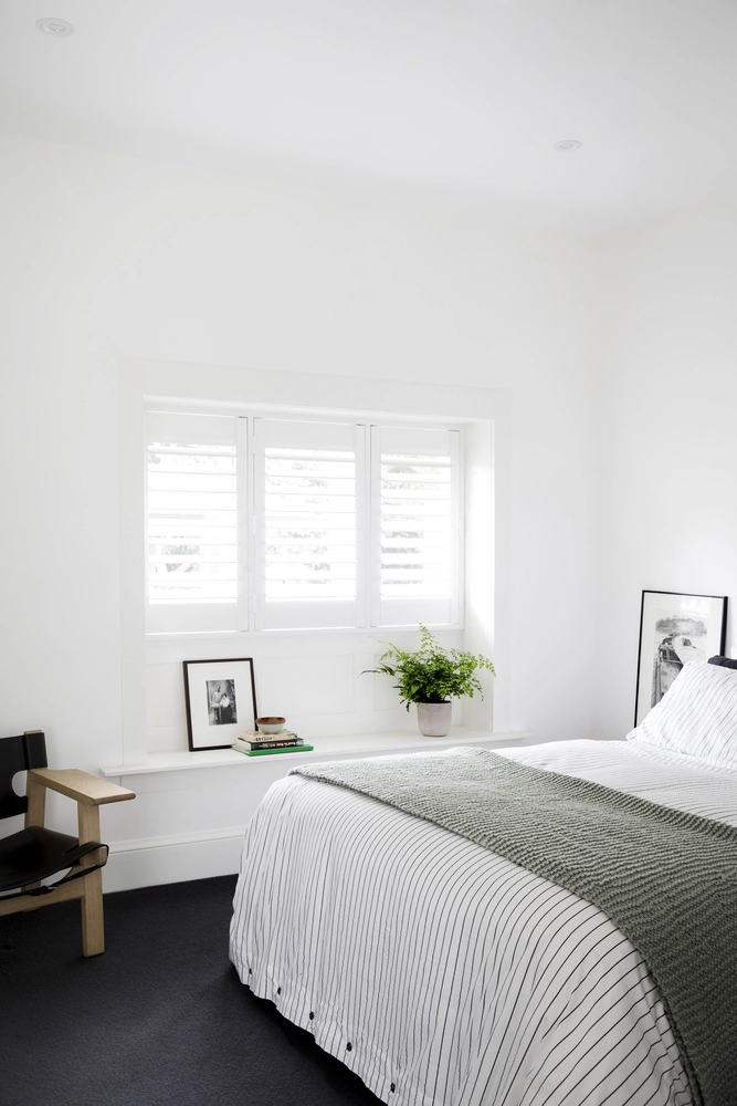 El salón de la antigua vivienda aparece transformado en un flamante dormitorio principal. Aquí, la moqueta oscura compensa la luminosidad del techo y las paredes. Incorpora así mismo un baño privado con lavabo doble y un espejo que refleja uno de los patios internos.