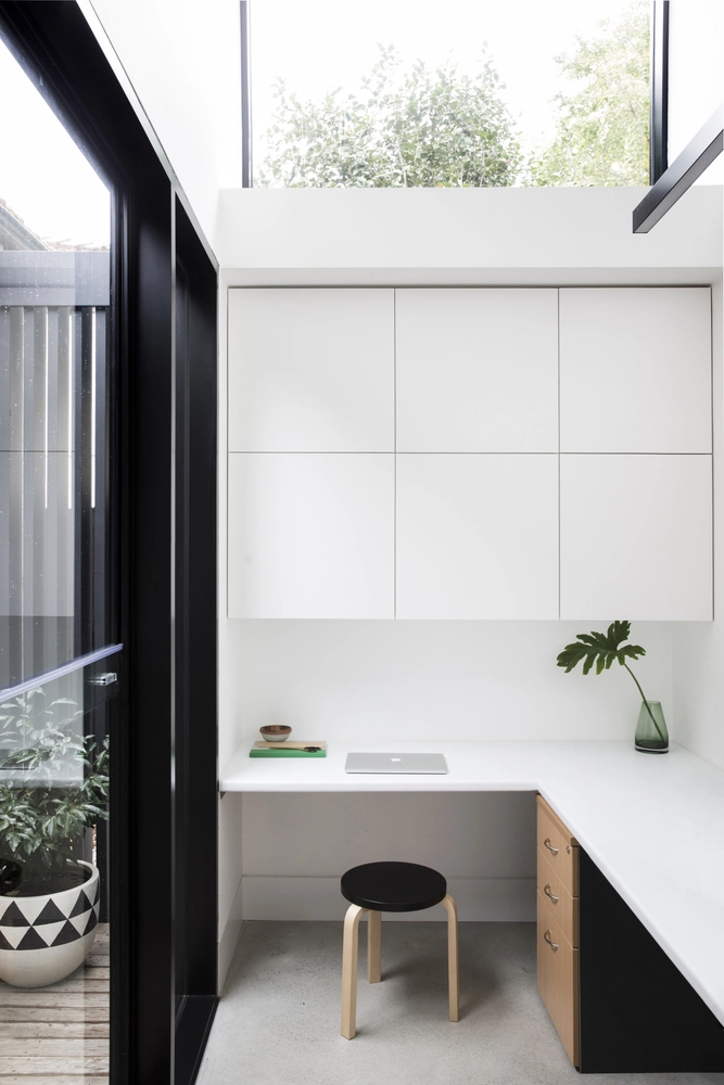 Un pasillo privado conecta la parte antigua con la reciente. Esta unión se aprovechó para crear dos estrechos patios interiores a cada lado del corredor. Al ser abiertos, la luz del sol ilumina ahora ambas partes de la Allen Key House. En la habitación contigua a uno de ellos se ha habilitado un pequeño despacho con escritorio en L y armarios a medida que sacan el máximo partido de unas dimensiones reducidas.