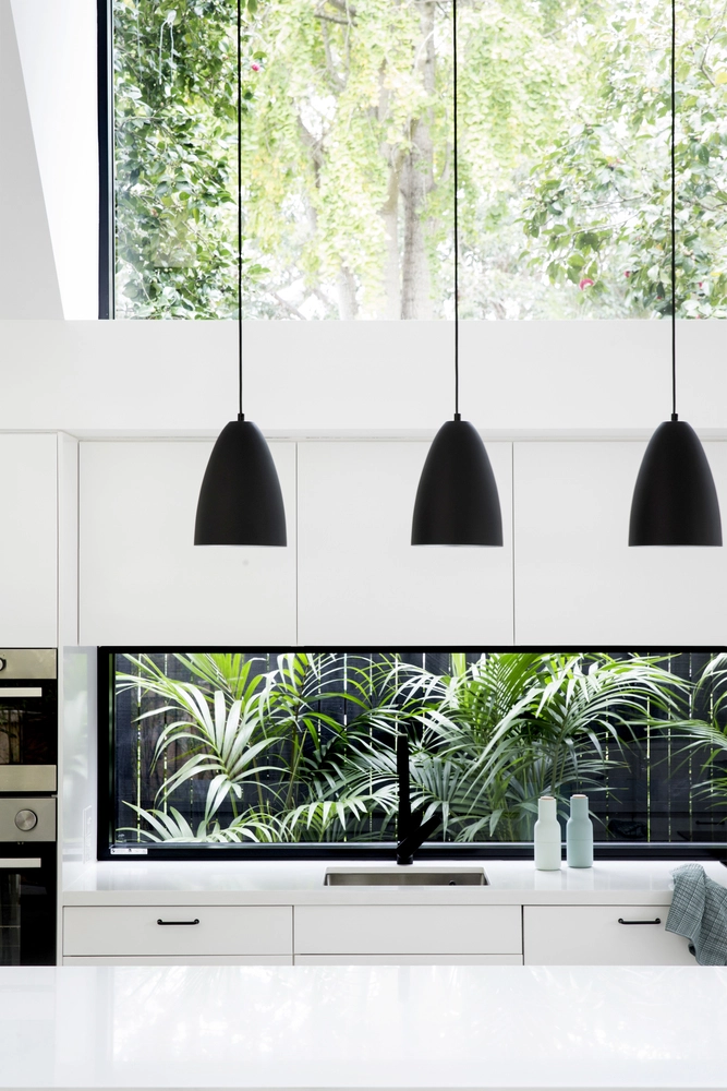 Los grandes ventanales inundan de vegetación el interior y resaltan el techo a doble altura en cada uno de los laterales. A su vez, las lámparas colgantes sobre la isla de la cocina y el comedor acentúan con su minimalismo el desarrollo en vertical de este falso cobertizo.