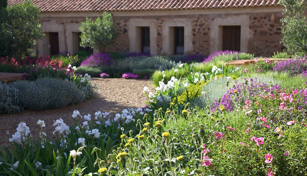 En Toledo, proyecto de Urquijo Kastner (Estudio de Paisajismo). Se trata de la primera fase de un proyecto mayor. En este caso, se ha intervenido en el patio de trabajo de un cortijo/caserío agrícola, cuya construcción original ha sido cuidadosamente restaurada. La distribución del espacio y la necesidad de habilitar una zona de paso para vehículos y otra de estar grande, condicionaron el diseño del jardín y los espacios para plantación. En cuanto a las especies, se tuvieron en cuenta los bruscos cambios de temperatura de la zona -que generan un tipo de vegetación llamada Garriga- y el consumo responsable del agua y su racionalización para la obtención de un jardín con mínimo mantenimiento. La Garriga es una formación vegetal mediterránea de gran riqueza botánica y paisajística, resultado de la degradación del bosque a consecuencia de la presión ejercida en forma de sobrepastoreo, talas, sequía estival, incendios recurrentes y lluvias violentas durante miles de años.