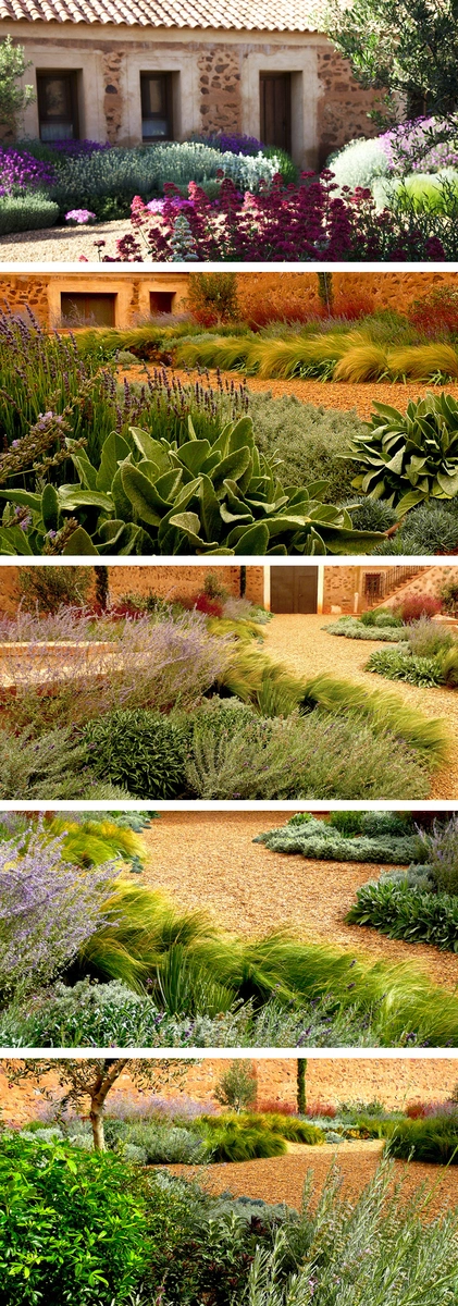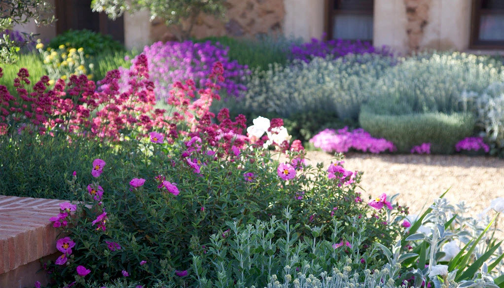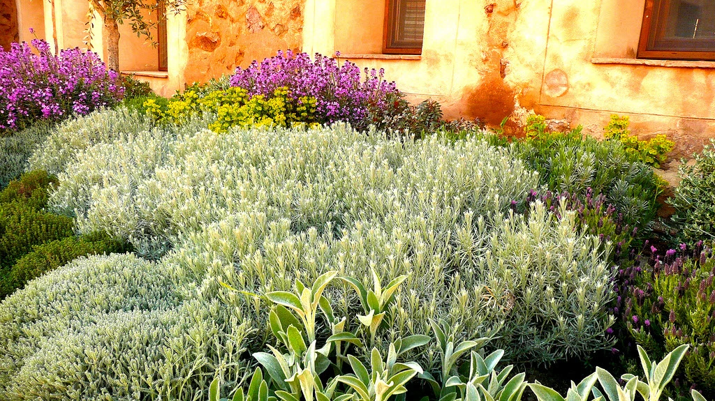 Las especies elegidas tienen una gama de tonos plateados, glaucos, rosas y violáceos que dan un aire tranquilo a este jardín y armonizan con los tonos ocres de los muros. La riqueza de formas y texturas foliares hacen que éstas mantengan un dialogo constante; además, surgen olores y aromas que van desde el fuerte especiado del Helichrysum al ligero y delicado del Iris. La edificación existente, con muros de mampostería antigua que rodea todo el espacio, confieren a todo el conjunto un efecto de acabado y madurez difícil de lograr en un jardín que no llega al año (normalmente, los jardines necesitan de varios años para conseguir desarrollar las plantas que darán cobertura y abrigo al jardín; plantas que aíslen del entorno y al mismo tiempo, creen una pantalla o telón de fondo, donde el jardín interior se pueda proyectar y contrastar). En este jardín, son la casa y los muros perimetrales los que proporcionan ese efecto de manera inmediata, logrando además, una sensación de abrigo, sosiego y resguardo.