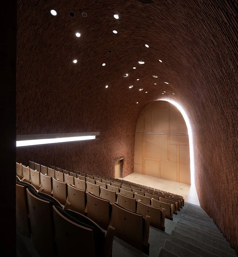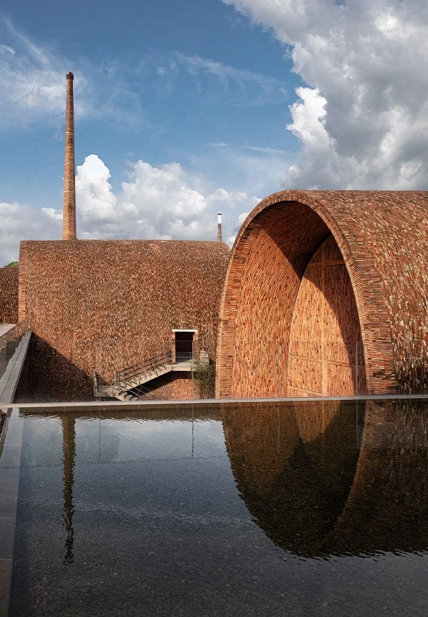 Las estéticas y características bóvedas se asientan en el terreno por debajo del nivel de suelo del entorno. Este gesto permite una gran flexibilidad al adaptarse al lugar logrando una escala íntima y humana en algunos espacios interiores y patios, y otra escala mas simbólica y monumental en espacios más públicos y concurridos.