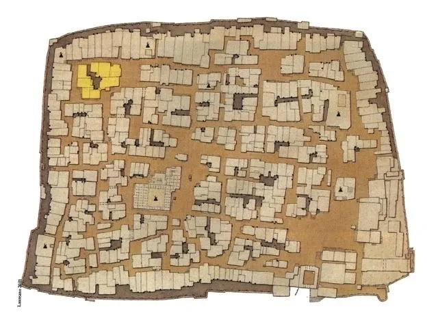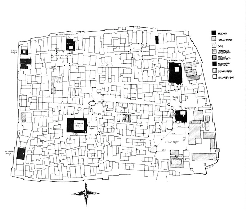 Con una planta de 330 metros de largo y 240 metros de ancho, aún conserva la muralla defensiva que la protegía de las incursiones beduinas. Visto lo expuesto del territorio, se optó por un crecimiento vertical compacto, con edificios muy próximos conectados mediante pasarelas en altura para defenderse mejor de los ataques.