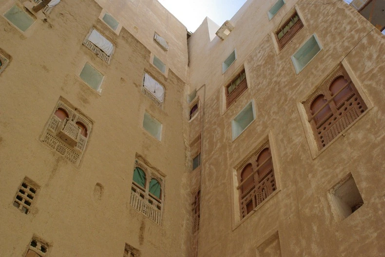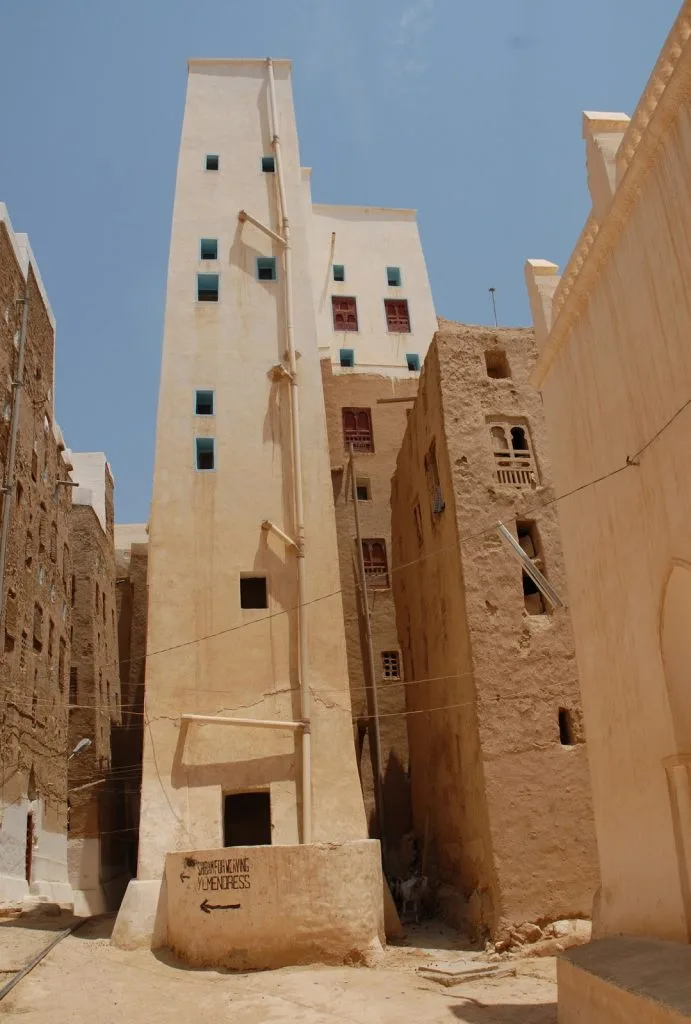 Forzados a utilizar los pocos materiales a su alcance, los habitantes de Shibam levantaron sus viviendas con adobe y troncos de palmera. Multitud de ladrillos de barro dieron forma a unos edificios de sección trapezoidal, pues los muros portantes van disminuyendo conforme aumenta su altura.