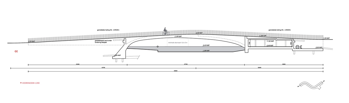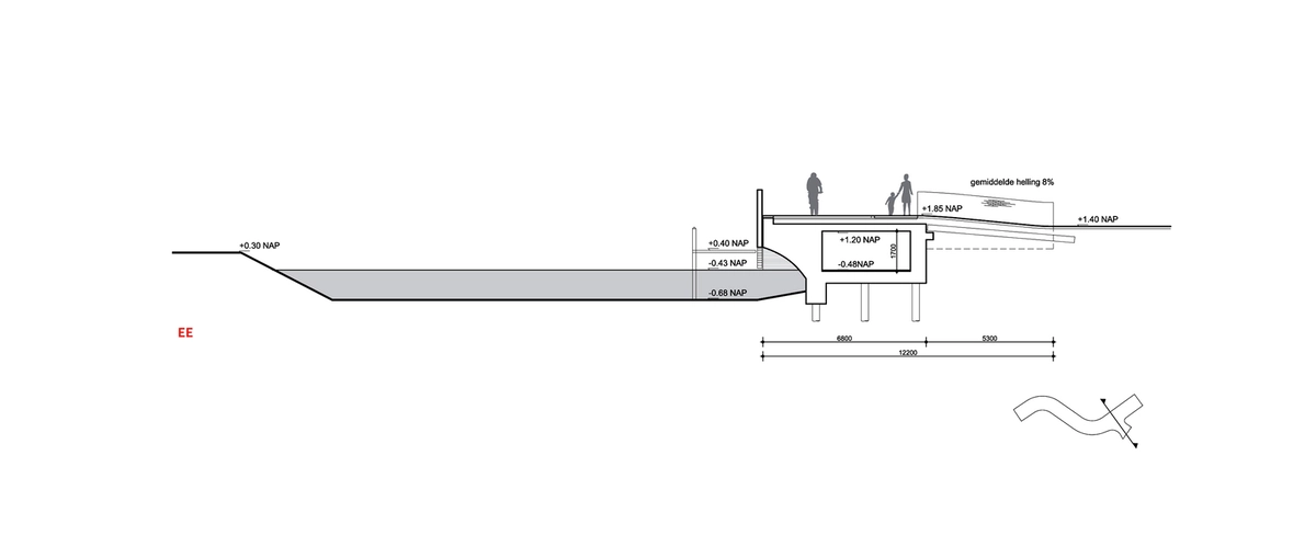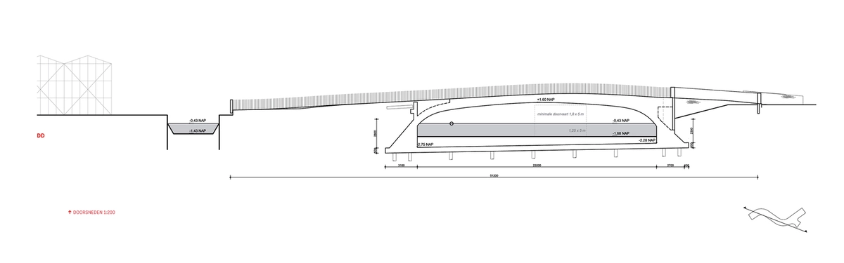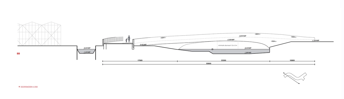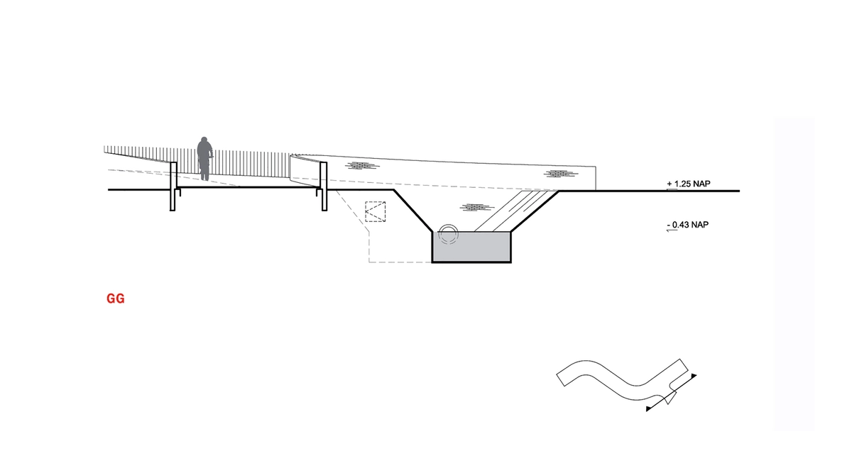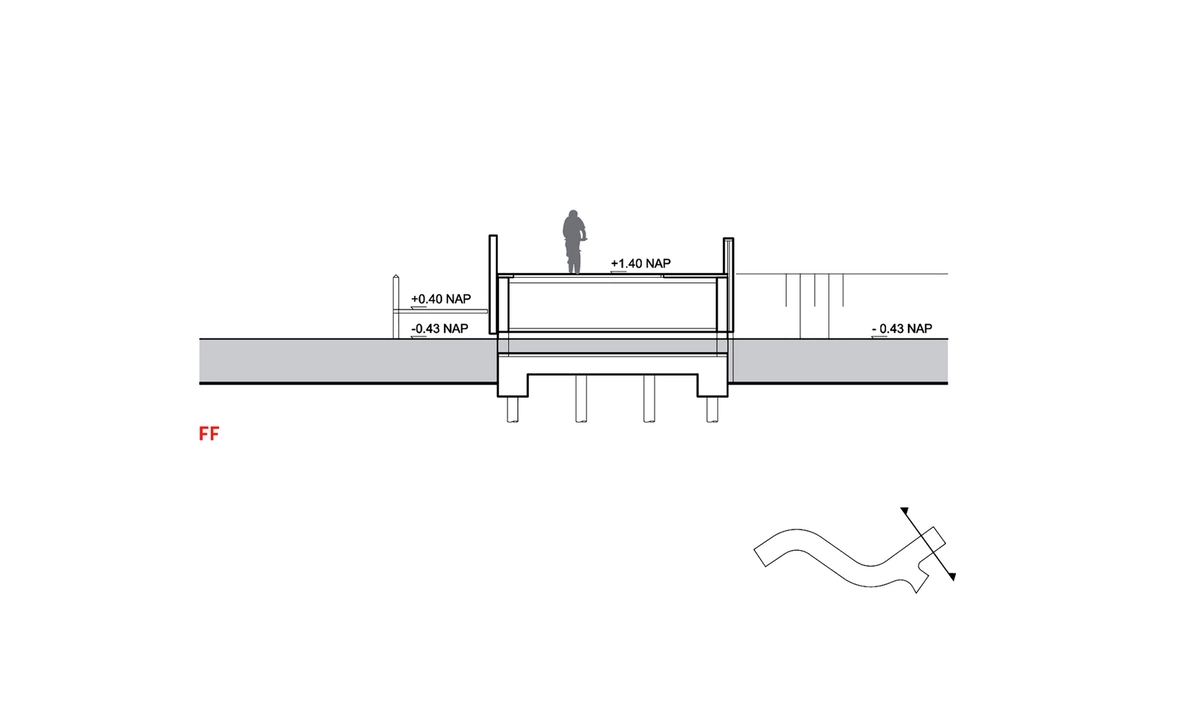 En su punto más alto, el Vlotwateringbrug realiza un giro y permite una vista panorámica sin obstáculos de la Poelzone. Ese contorno de 25 metros en forma de S se sustenta mediante un arco de presión que se inclina bajo el puente.