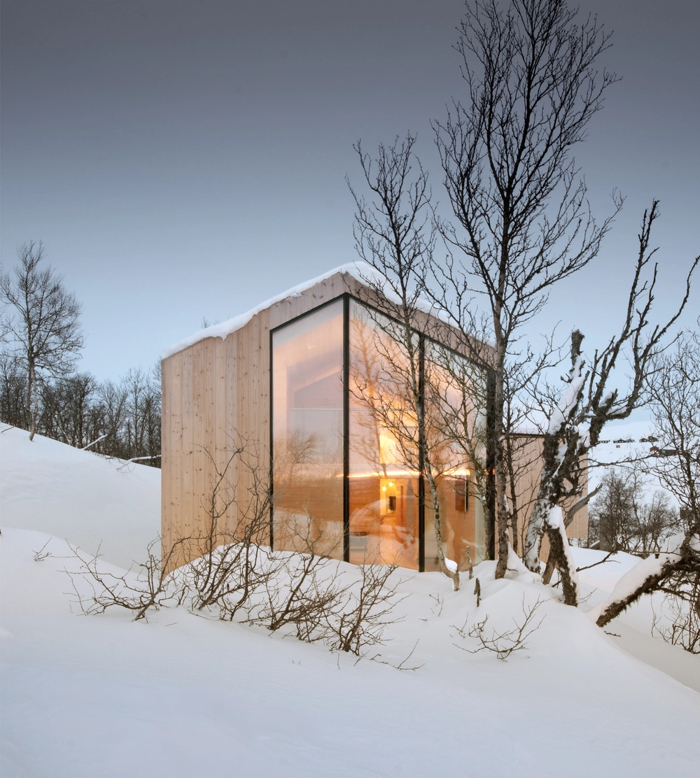 En el interior, la cocina central presidida por una chimenea de doble cara y una gran mesa en voladizo sirve de punto de encuentro y distribuidor hacia el sótano, las habitaciones sobreelevadas, un cuarto de baño con sauna y los dormitorios, a los que se accede mediante puertas correderas. Todo un refugio invernal en la más pura tradición noruega de hospitalidad y respeto por la naturaleza.