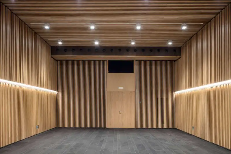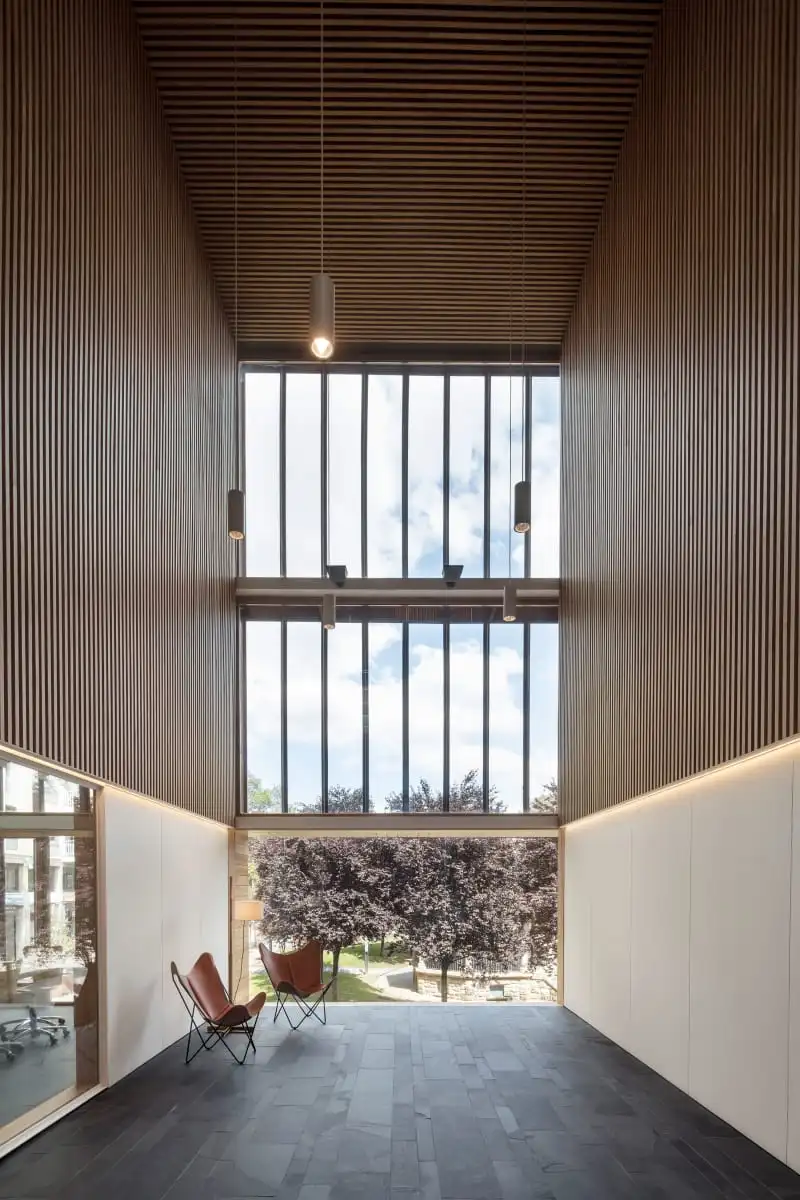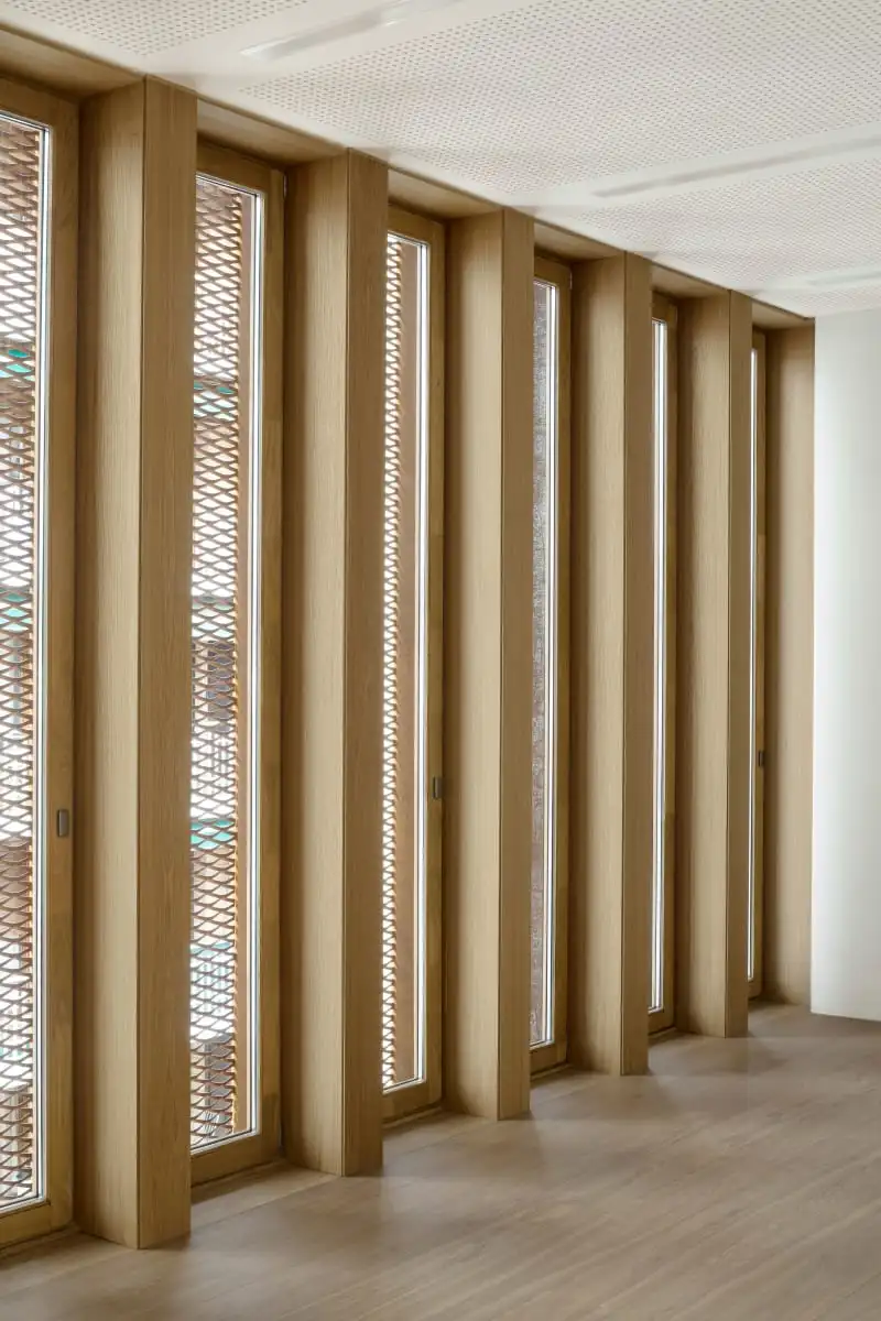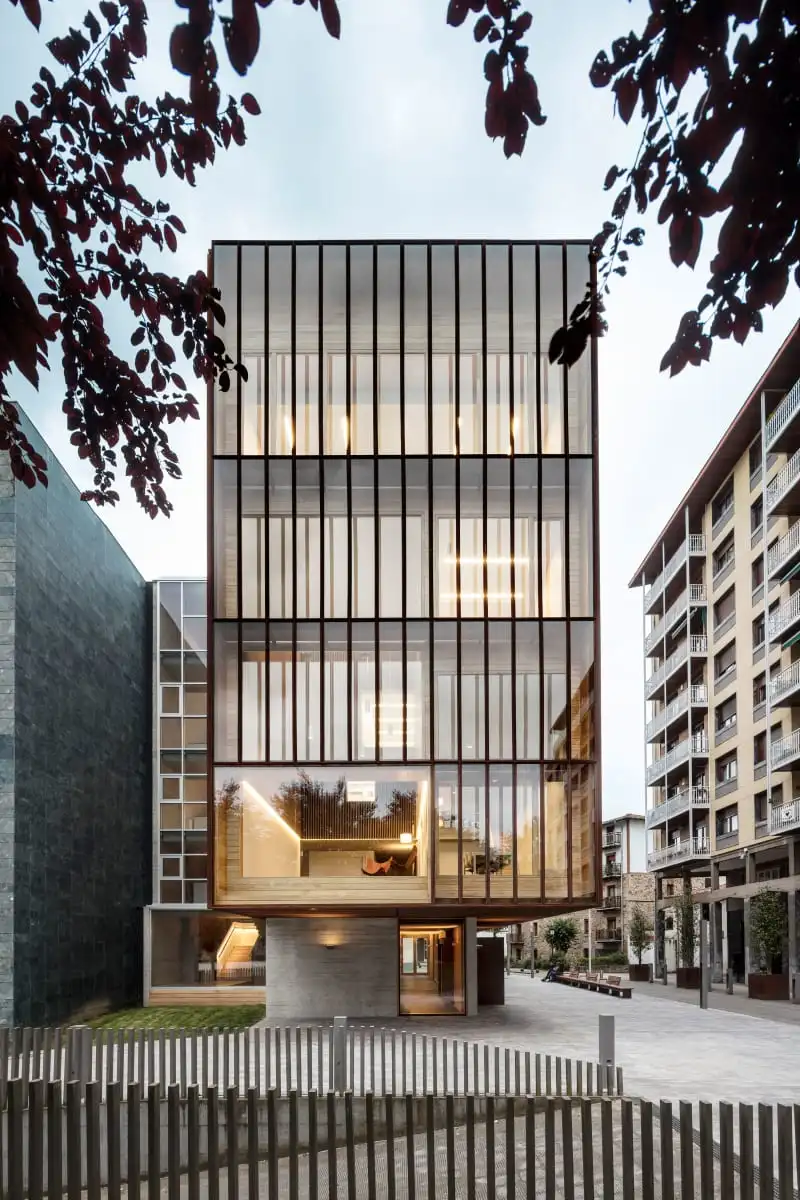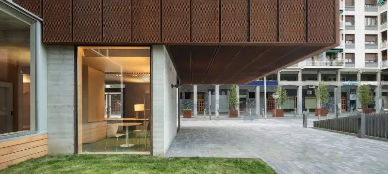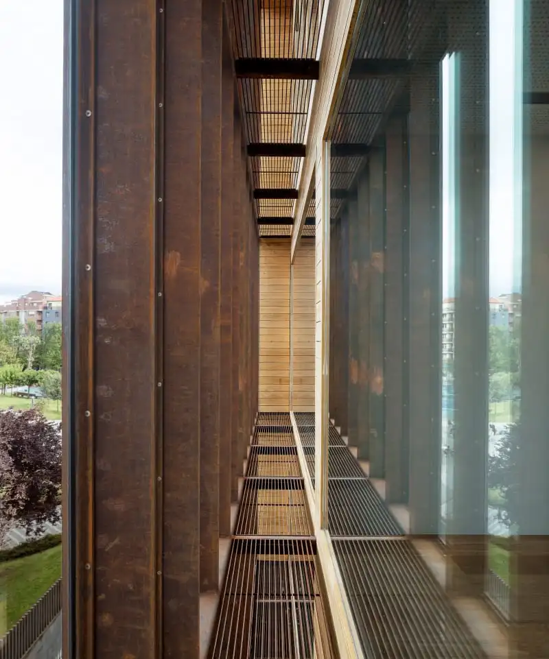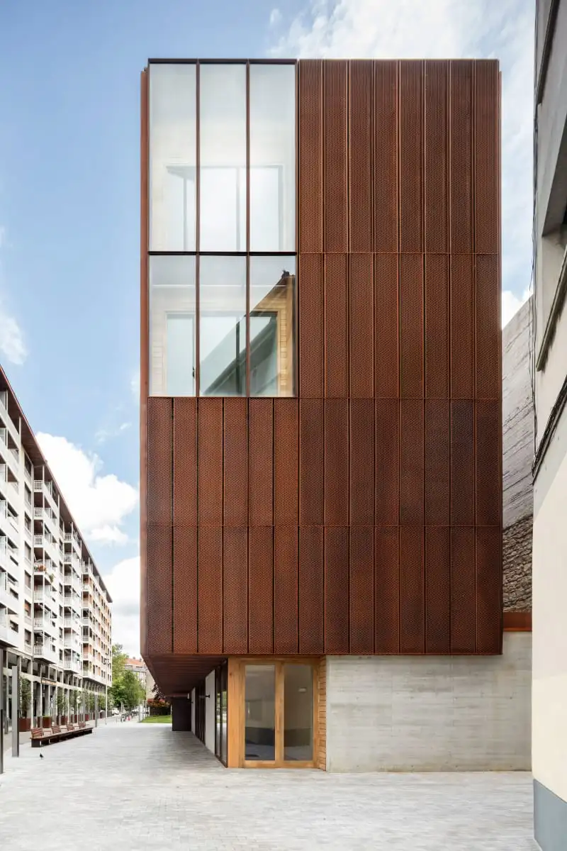 Por su parte, el enrejado metálico que reviste tres de las caras del prisma enfatiza el aire vanguardista de la obra y actúa de celosía, tamizando la luz del sol sobre las aulas. Exenta y elegante, la nueva Escuela de Música destaca así airosa en la nueva estética del parque Zelaieta.