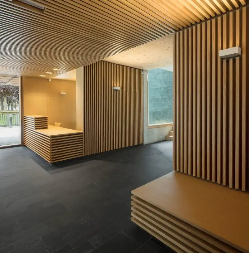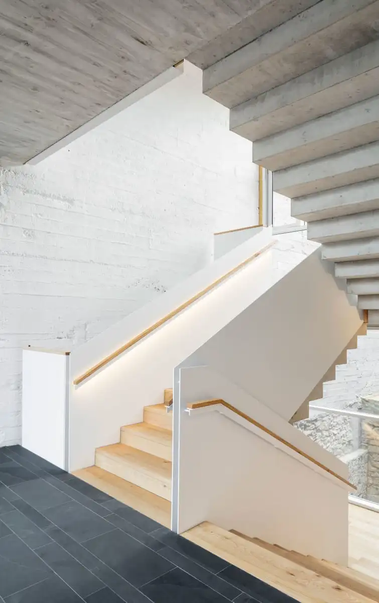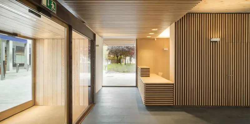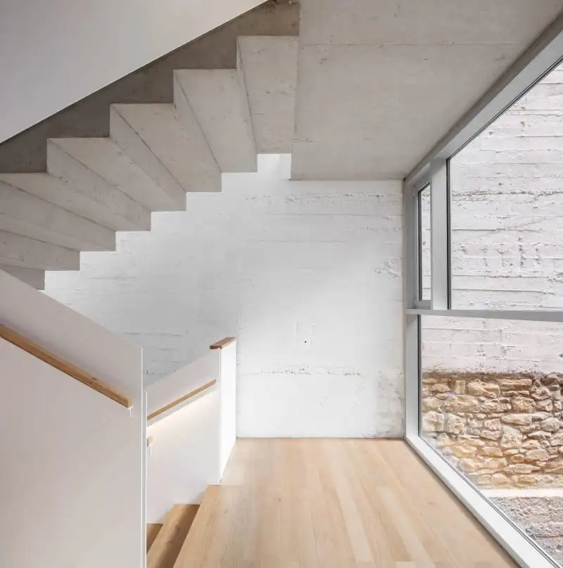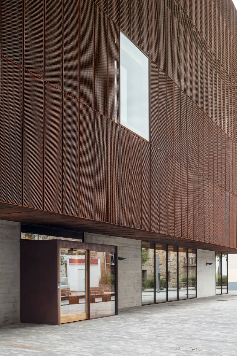 Uno de los protagonistas del proyecto es el muro original en piedra del antiguo frontón de la localidad, que se incorporó como seña de identidad. Junto a él, un tramo de hormigón y el acabado reluciente del centro cultural se organizan en estratos que dejan ver la huella del tiempo al mirar los distintos muros superpuestos.