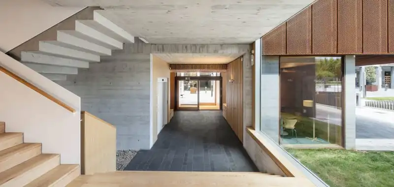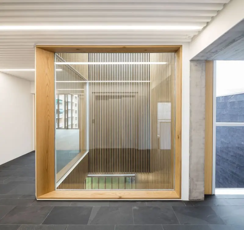 Al colocar las escaleras como nexo de unión virtual con el centro Zelaieta, este planteamiento de caja compacta aprovecha al máximo todo el espacio disponible para salas y aulas. A fin de obtener esas plantas diáfanas, la fachada prismática se convierte en un elemento portante. Además, la envolvente de cristal de las escaleras y uno de los laterales abre las vistas hacia el parque y llena de luz toda la escuela.