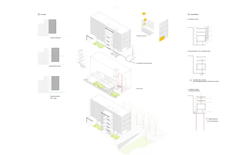 La propuesta es arriesgada, pero sencilla: separarse ligeramente con el objetivo de crear un patio en la planta baja y un vacío pasante en el resto de niveles. Para ello, se retrasa toda la fachada a pie de calle, consiguiendo un porche perimetral que realza la entrada. En cuanto a las tres plantas superiores, se apostó por un prisma regular en voladizo paralelo a la nueva fachada hasta completar más de 1.000 metros cuadrados de instalaciones.