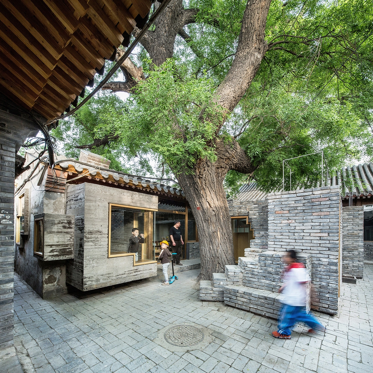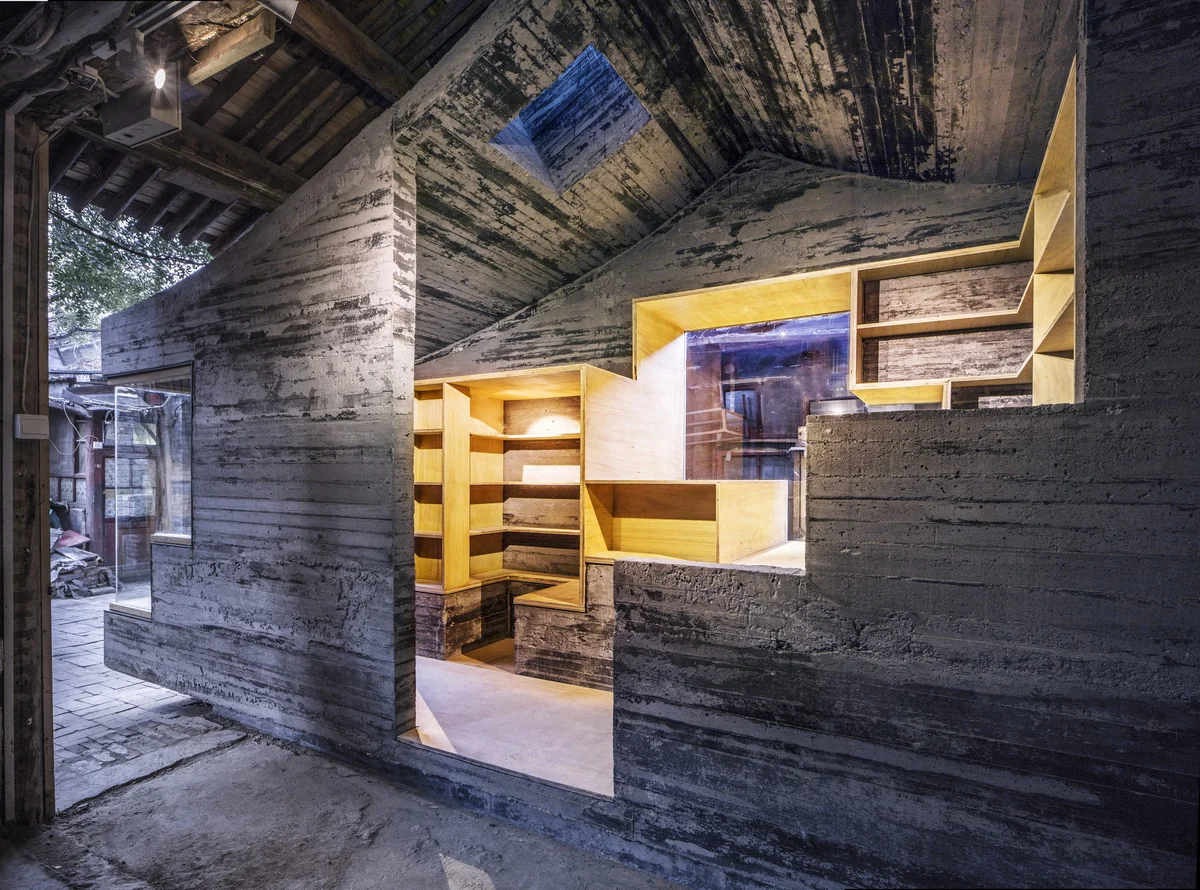 El equipo de Zhang Ke se centró en alguno de esos añadidos informales que aún se conservaban para rediseñarlos en vez de acabar con ellos de un plumazo. Así nació, por ejemplo, la minibiblioteca pública infantil de 9 m2, en hormigón mezclado con tinta china y colocada bajo el tejado de uno de los edificios originales. Una disposición interna en diferentes alturas permite que los niños utilicen los asientos como mesas improvisadas o bancos para tumbarse a leer.