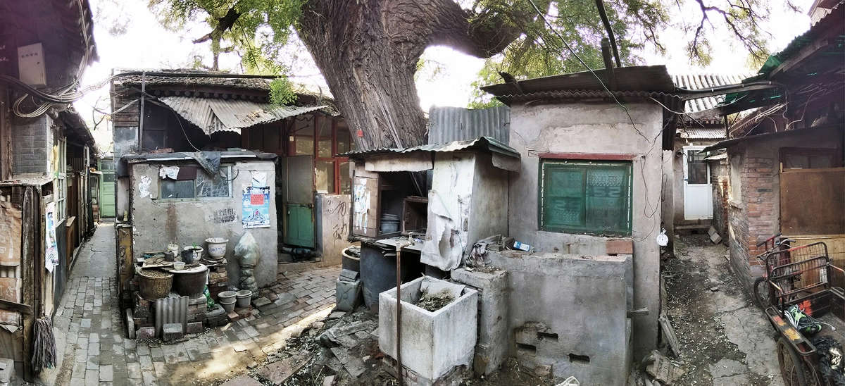 Con una historia de tres o cuatro siglos a sus espaldas, albergó hasta un templo, que en la década de 1950 fue convertido en pequeñas viviendas para más de una docena de familias. Cada una de ellas prolongó su escasa superficie construyendo una cocina hacia el patio, lo que aumentó todavía más la estrechez típica de un hutong tradicional.