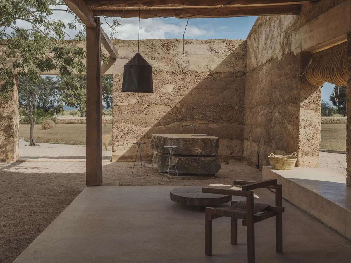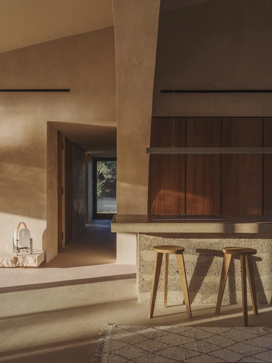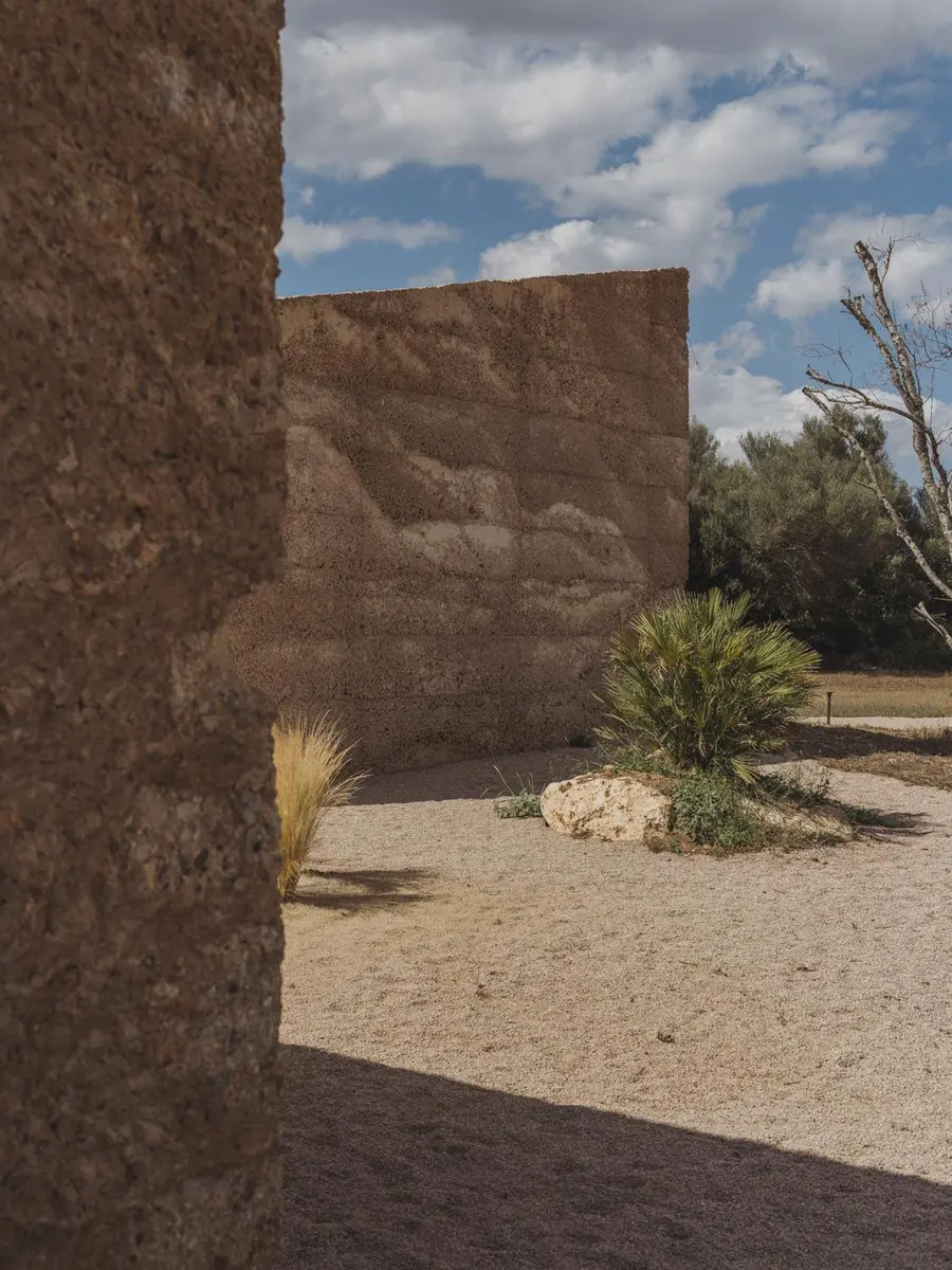 La materialidad refuerza esta vocación de integración con el entorno. Tierra compactada, cal y piedra se combinan para formar una estructura que no destaca, sino que se funde con el paisaje. Esta elección no responde solo a una voluntad estética, sino también a un compromiso con técnicas constructivas tradicionales y con el uso de recursos locales. La sostenibilidad, en este caso, no se enuncia como promesa, sino que se incorpora en cada decisión material y constructiva.