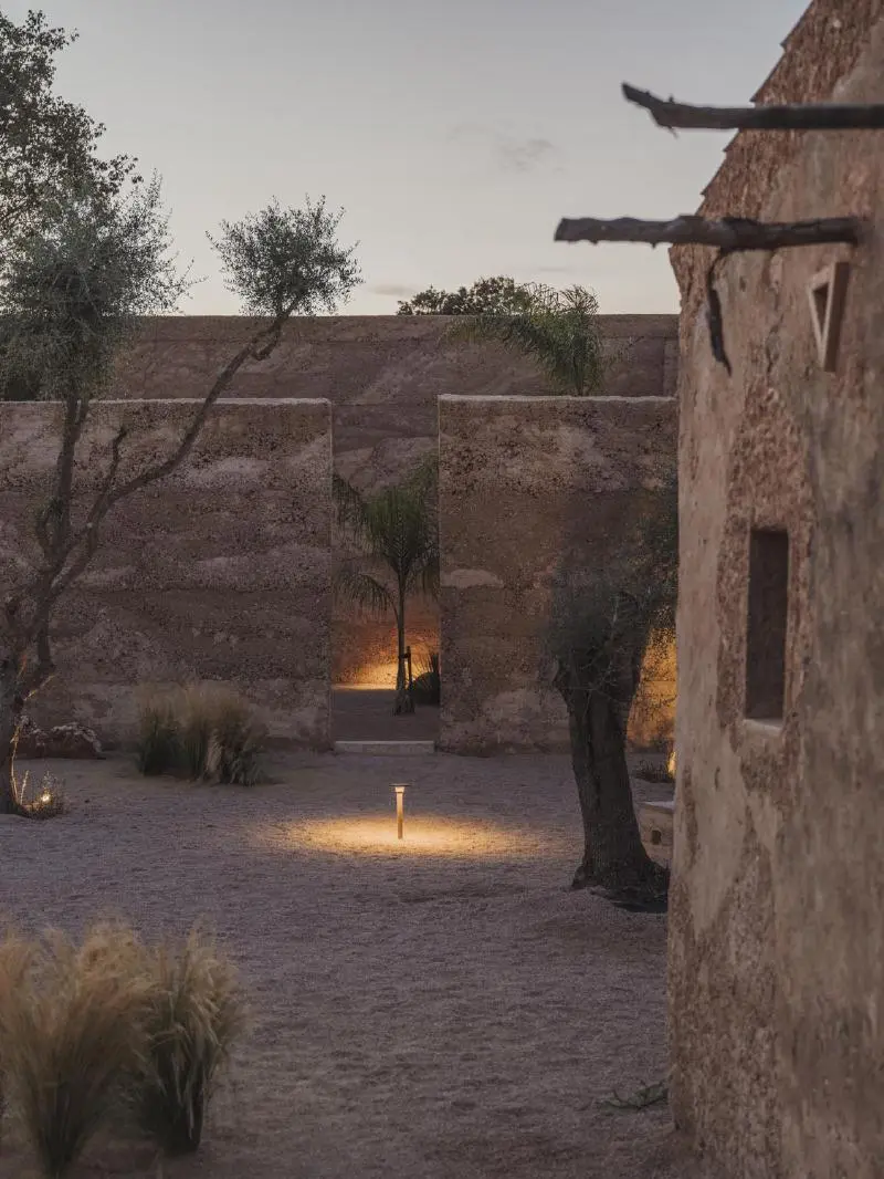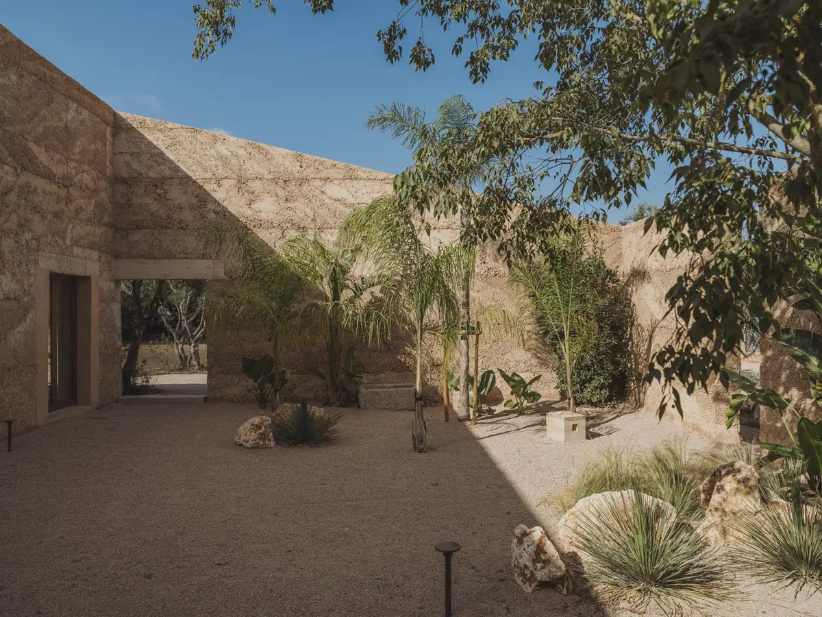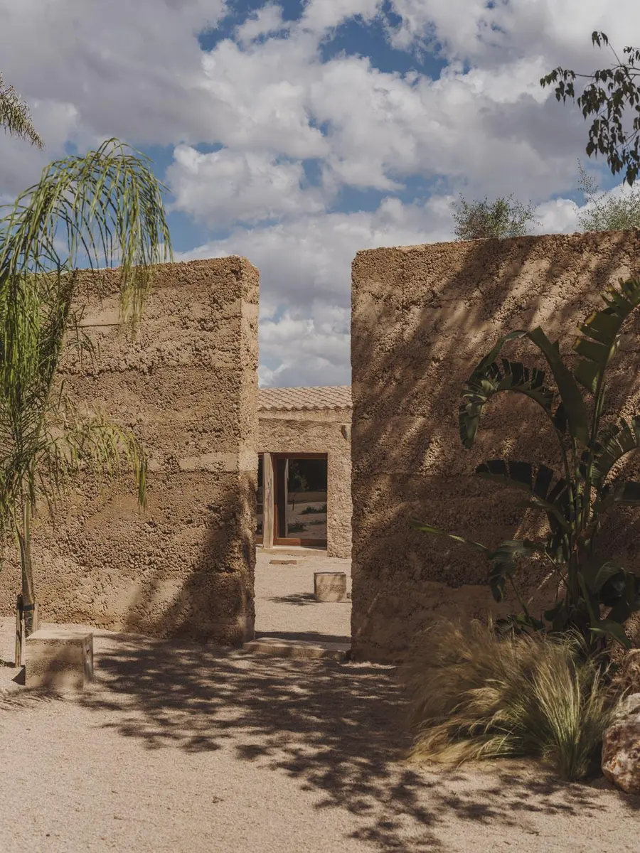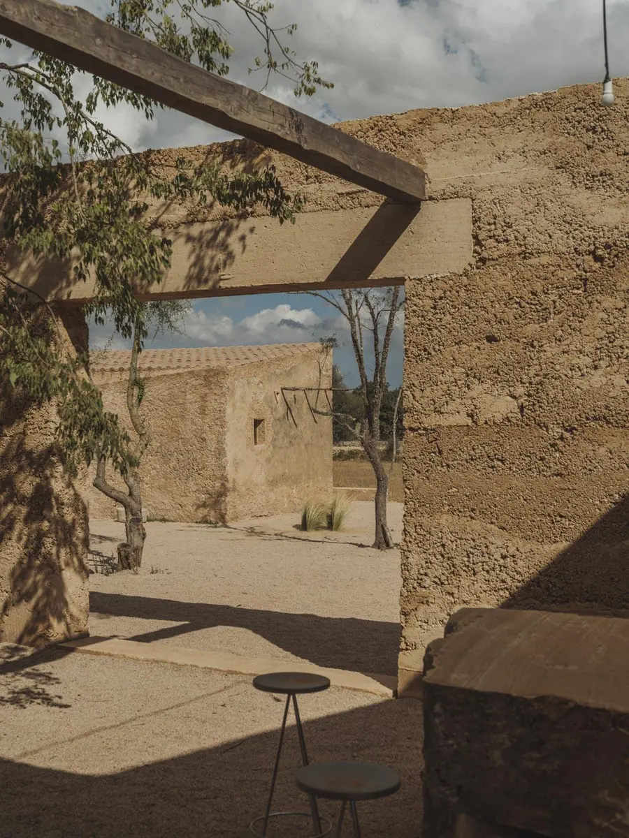 La materialidad refuerza esta vocación de integración con el entorno. Tierra compactada, cal y piedra se combinan para formar una estructura que no destaca, sino que se funde con el paisaje. Esta elección no responde solo a una voluntad estética, sino también a un compromiso con técnicas constructivas tradicionales y con el uso de recursos locales. La sostenibilidad, en este caso, no se enuncia como promesa, sino que se incorpora en cada decisión material y constructiva.