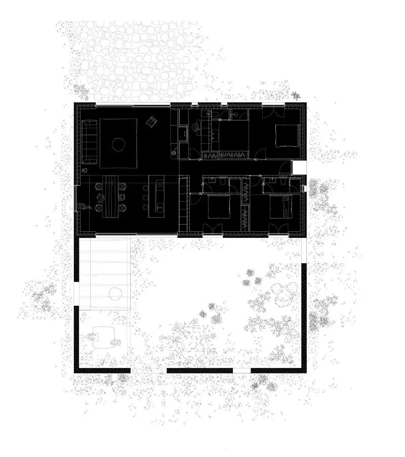 La decisión no es anecdótica. Frente al carácter abierto del entorno natural, la casa se repliega sobre sí misma para generar un vacío central de igual superficie que la vivienda. Este gesto, tan elemental como radical, permite una regulación natural del clima, de la luz y de la privacidad. No se trata solo de un espacio de transición, sino de un ámbito habitable, flexible, que acoge actividades comunes o individuales sin imponer un uso específico.