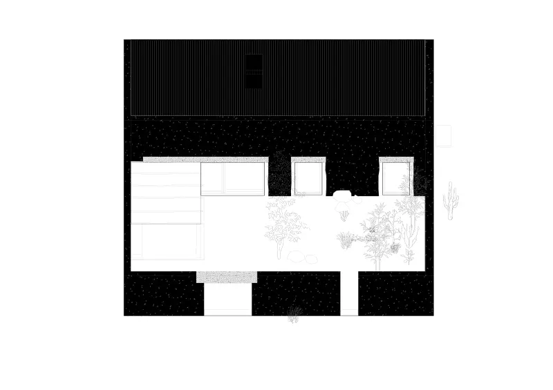 El patio no es aquí un decorado ni una extensión del espacio, sino una arquitectura en sí misma. Su diseño responde a la dualidad esencial entre recogimiento y exposición. A través de una alternancia de muros opacos y aperturas estratégicas, se configuran vistas enmarcadas, entradas controladas de luz natural y una relación cambiante con el exterior. La arquitectura no solo protege, sino que también revela.