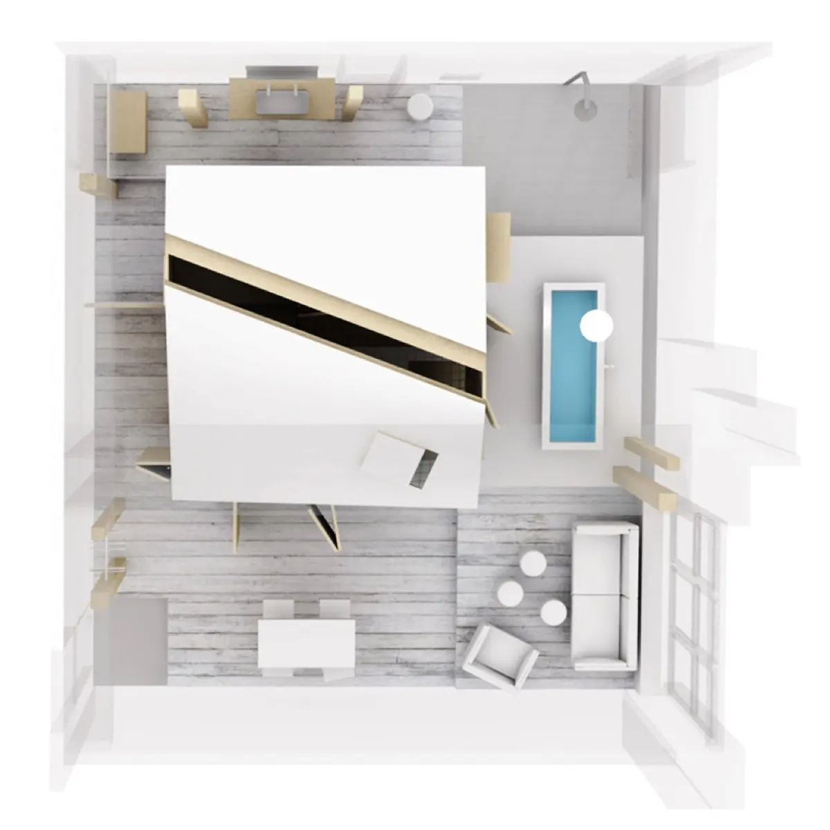 En síntesis, la habitación de hotel (una caja) esconde otra caja (el escondite) con forma de casa rodeada de un espacio vacío. «Queríamos crear una nueva categoría de habitaciones que mantuvieran la atmósfera y el espíritu del hotel único pero que introdujeran una estética nueva y más pura…”