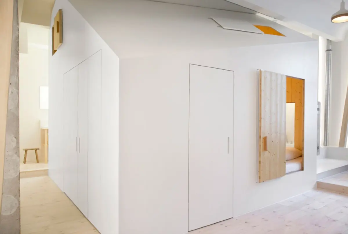 El arquitecto planteó un volumen de madera en forma de casa y un espacio circundante a modo de jardín, transformando así la habitación convencional en un espacio interior y otro “exterior”.