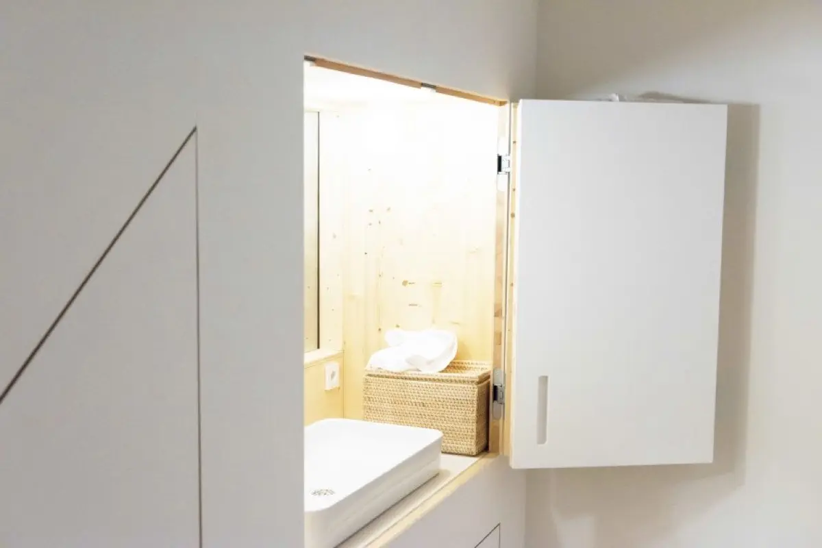 La habitación de Larsen cae dentro de la categoría «Escondite»; en consecuencia, el diseño buscaba generar un espacio habitable que el huésped pudiera explorar y personalizar.