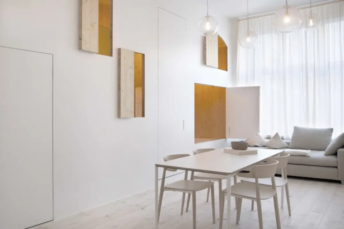 El volumen cerrado se percibe rotundo, blanco y tranquilo desde el exterior, y la luz natural fluye por el espacio circundante, el “jardín”, también en blanco. Las numerosas aperturas, a modo de puertas y ventanas, abren el volumen revelando un cálido y acogedor interior en madera y permiten usar el espacio de múltiples maneras.