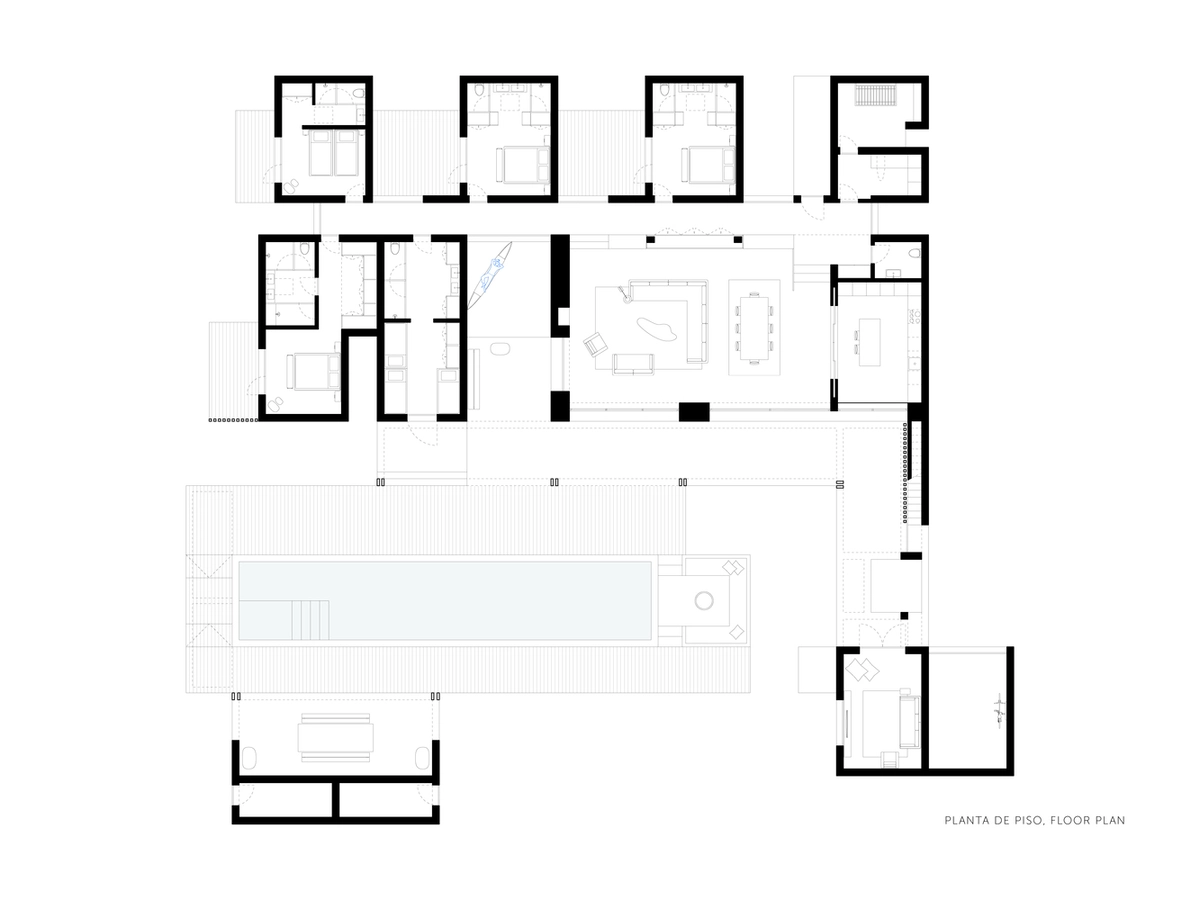 En torno al bloque principal se disponen los cinco dormitorios con baño, resueltos como volúmenes separados conectados por un largo pasillo interior. Esta fragmentación tan marcada permite generar huecos y patios para que cada residente tenga su propio espacio privado.