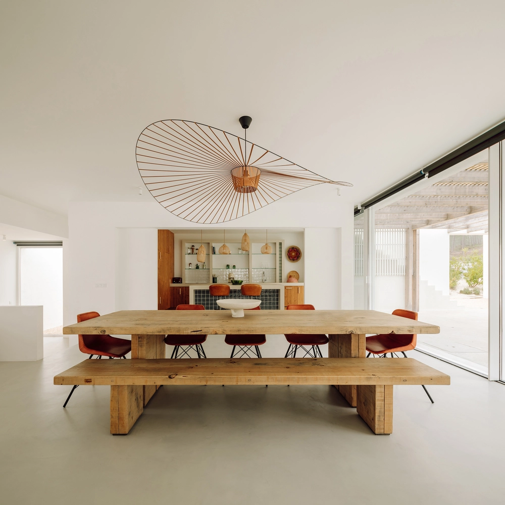 El núcleo central de Comporta 10 lo forman la cocina, el comedor y el salón, planteados como un único espacio abierto. Los grandes vanos estructurales y las puertas correderas de cristal potencian la sensación de vivir al aire libre en estas áreas comunes. Además, la decoración interior con muebles de madera maciza y colores terrosos brinda una calidez especial, aumentada por breves chispazos de rojo, naranja y verde.