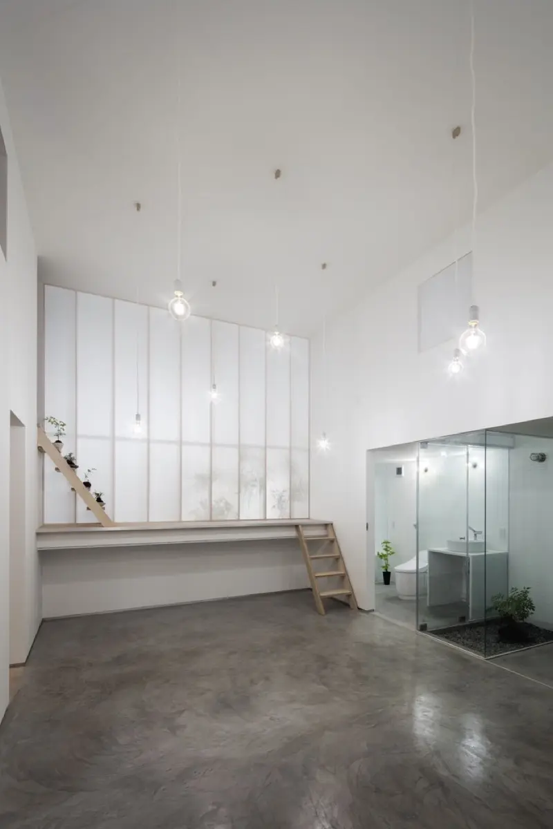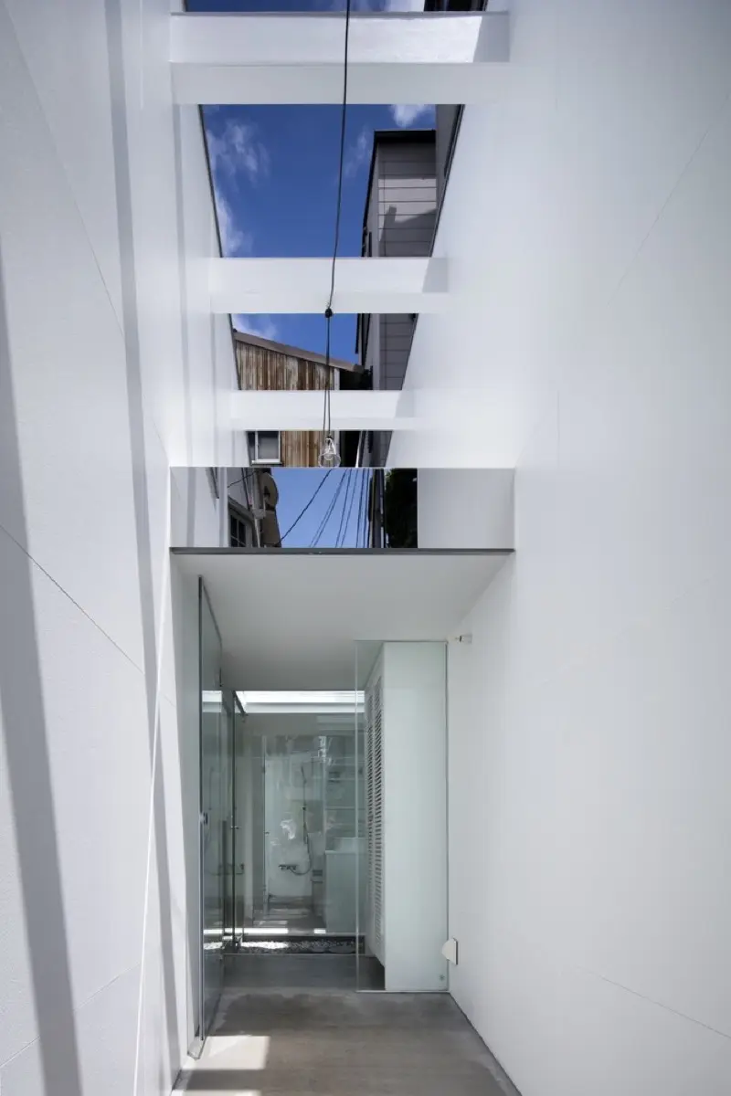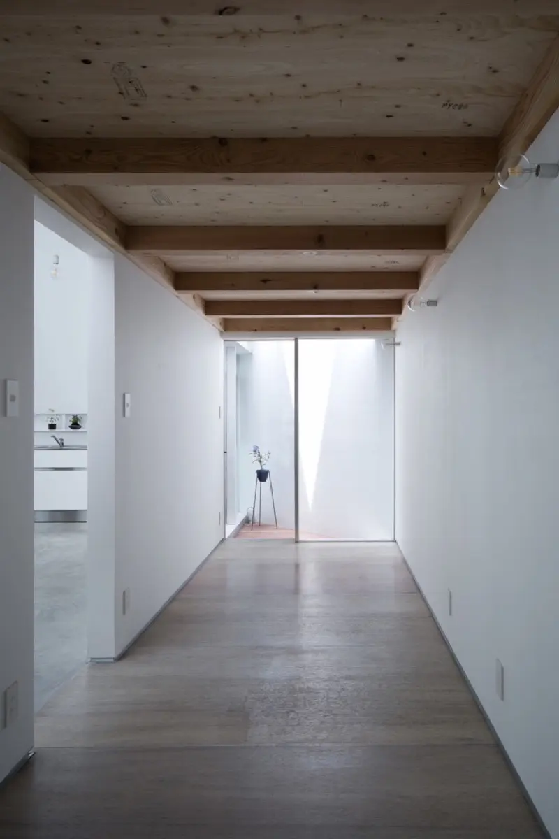 Un gran vacío central de doble altura configura el espacio de estar, en torno al cual se ubican los patios de luz y los espacios servidores: cocina y comedor, baño, almacenaje. Todos de carácter minimalista y resueltos con lo esencial. Aunque carecen de vistas, todos los espacios tienen luz natural y ventilación a través de alguno de los patios.