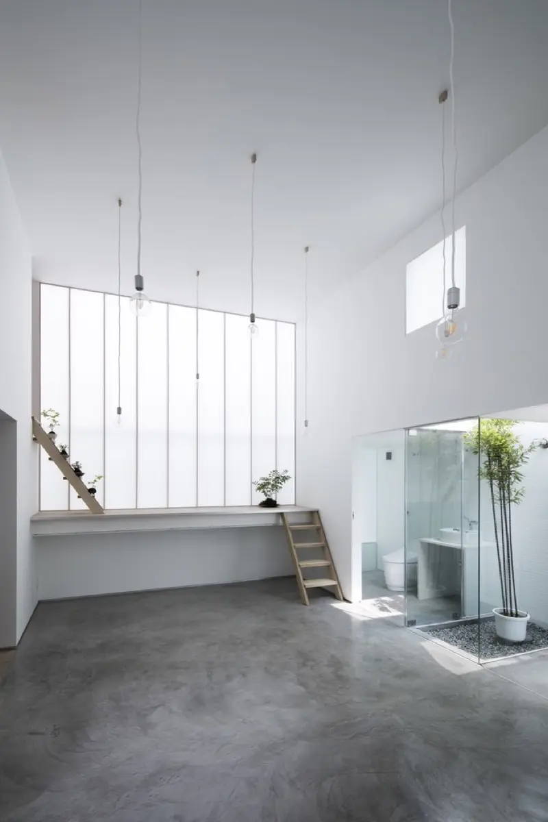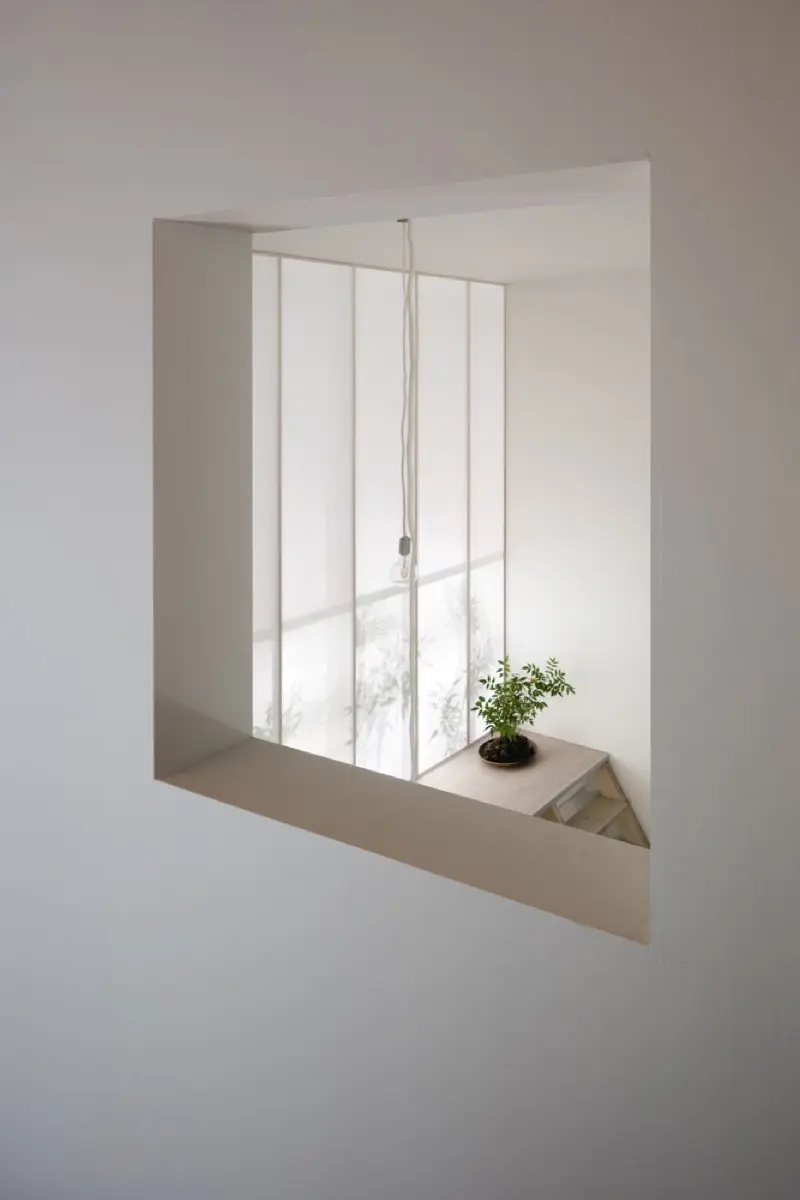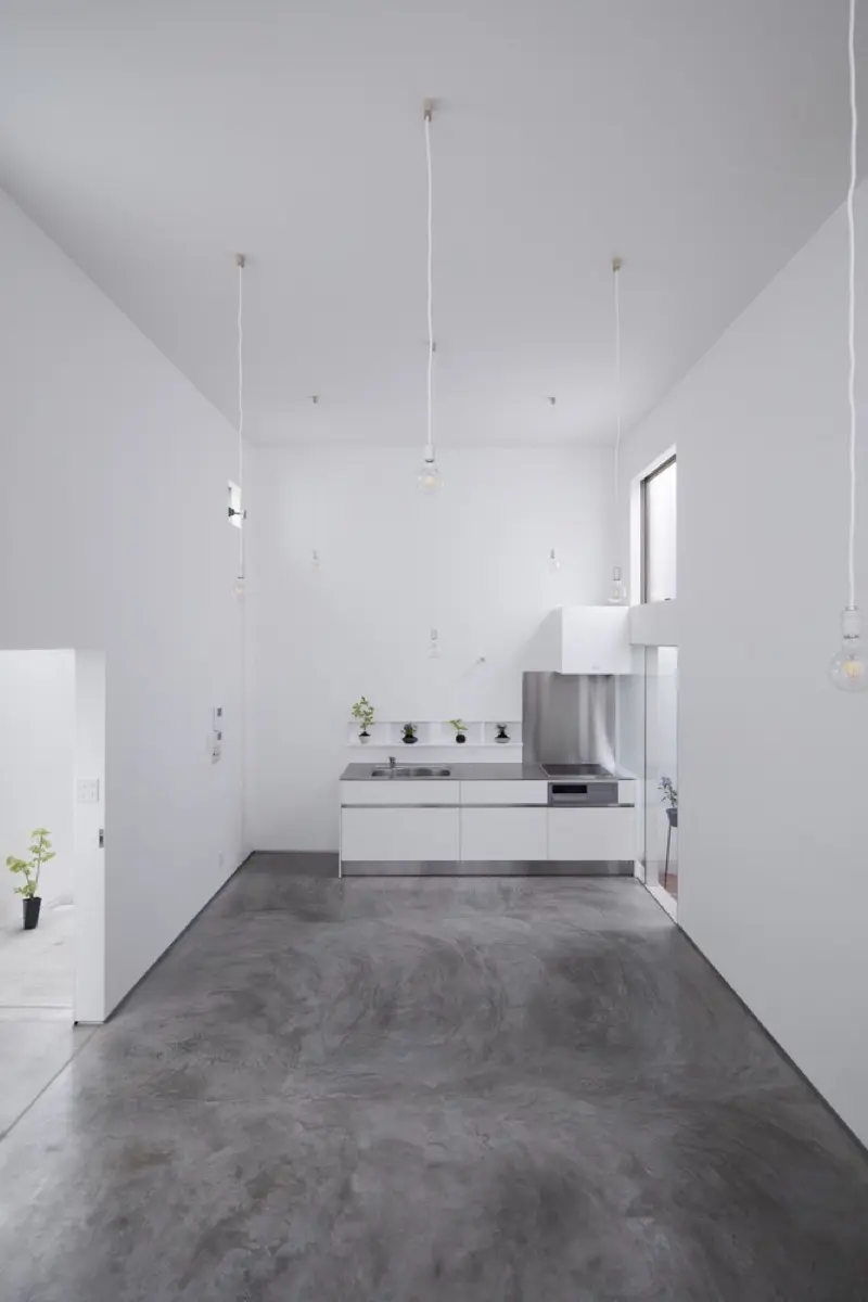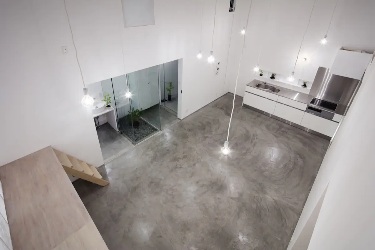 Un gran vacío central de doble altura configura el espacio de estar, en torno al cual se ubican los patios de luz y los espacios servidores: cocina y comedor, baño, almacenaje. Todos de carácter minimalista y resueltos con lo esencial. Aunque carecen de vistas, todos los espacios tienen luz natural y ventilación a través de alguno de los patios.