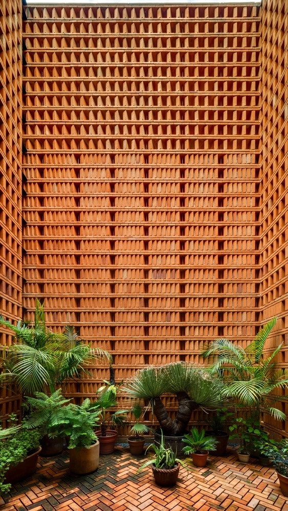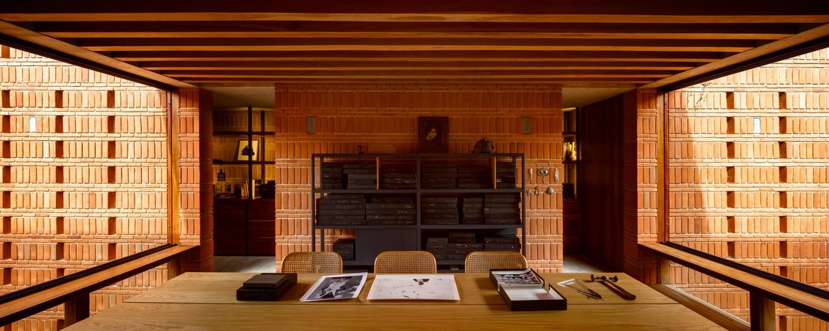 Los cerramientos acristalados de suelo a techo evitan romper la magia de los patios interiores, favorecida por la continuidad del ladrillo como elemento constructivo dentro de las estancias. Su presencia masiva llega a ocultar casi por completo el armazón interno de acero y hormigón; hasta la madera de tzalam se mimetiza en colorido con las piezas cerámicas. En definitiva, un estudio cerrado sobre sí mismo en busca de la paz y la concentración necesarias para alentar la creatividad.