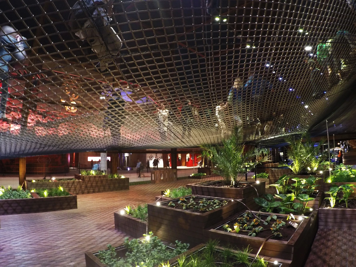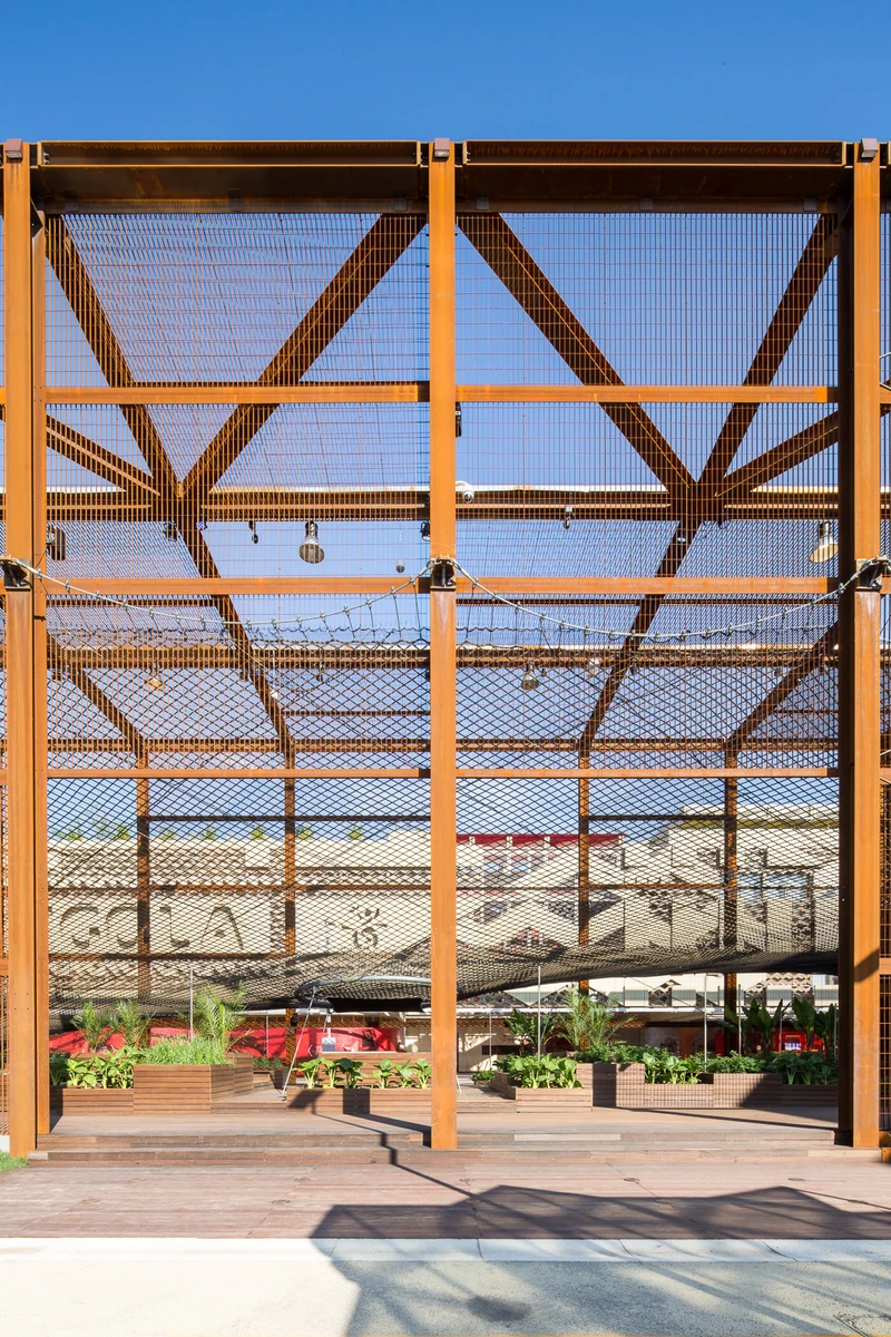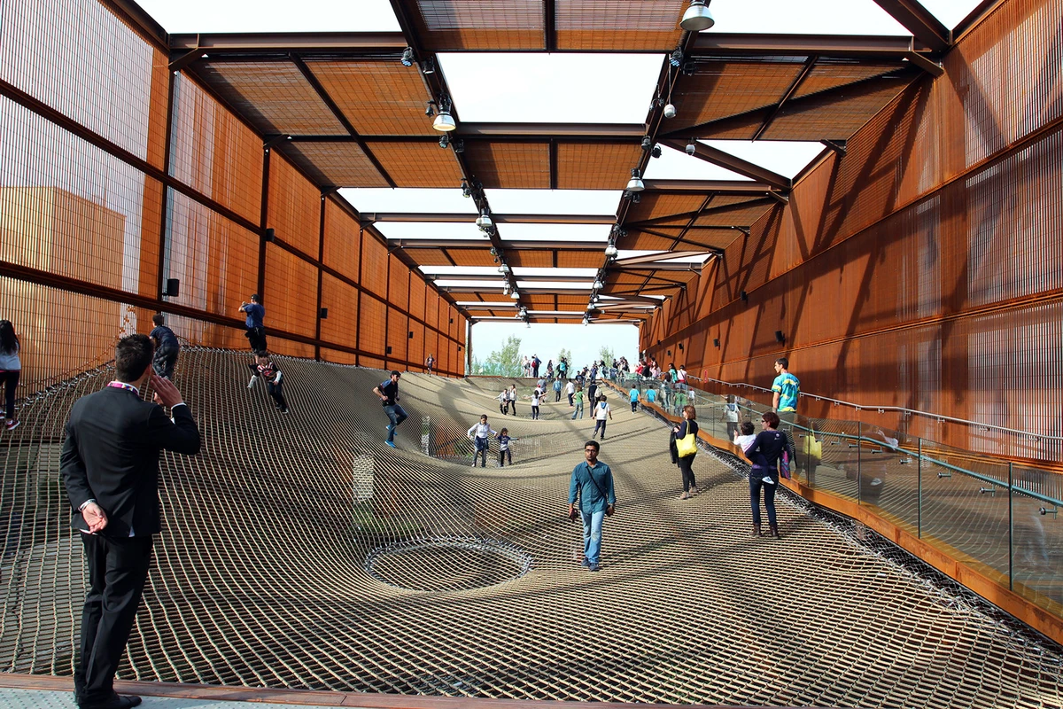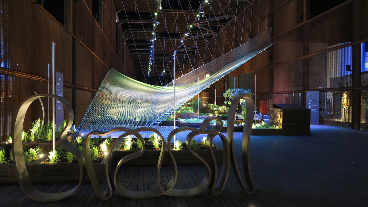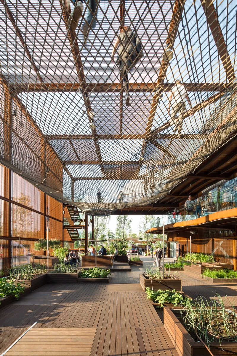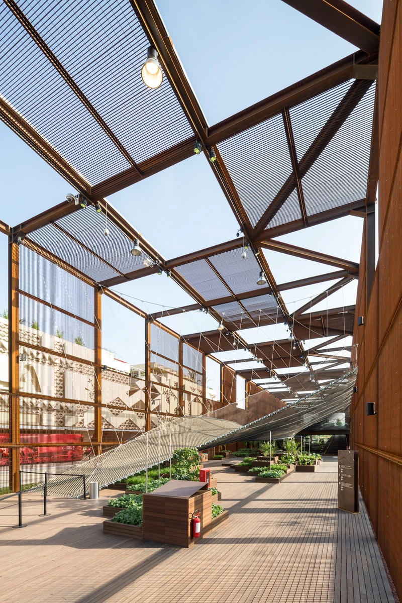 La red es una metáfora de la cultura de Brasil, porosa y colaborativa, pero también de la industria agrícola nacional, entretejida por pequeños, medianos y grandes productores que fomentan un intercambio constructivo. Un área lúdica permanente por la que se puede caminar de otra manera y que proporciona sombra a la gran plaza inferior. Allí, un paisajismo ondulado evoca al Amazonas con flores, vegetación, cultivos típicos y cinco «plantaciones» con mesas interactivas sobre nutrición y agricultura familiar. Se creó así una zona ideal para el ocio, el descanso o el intercambio cultural.