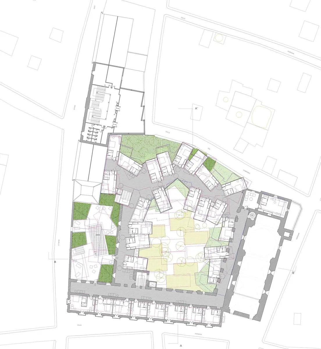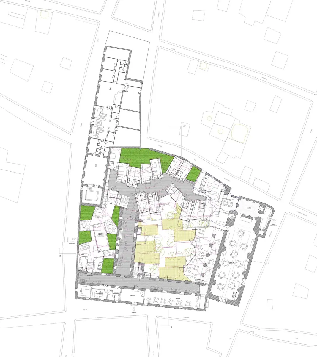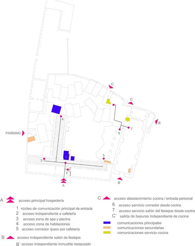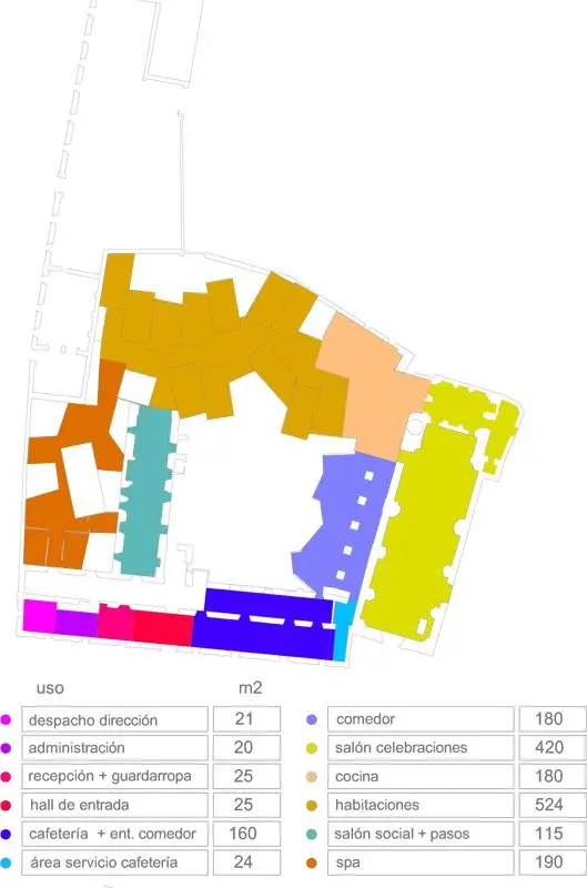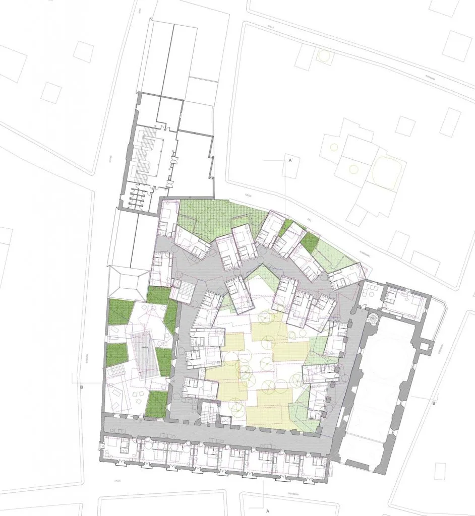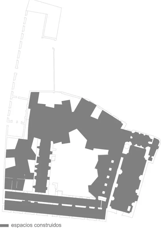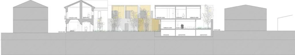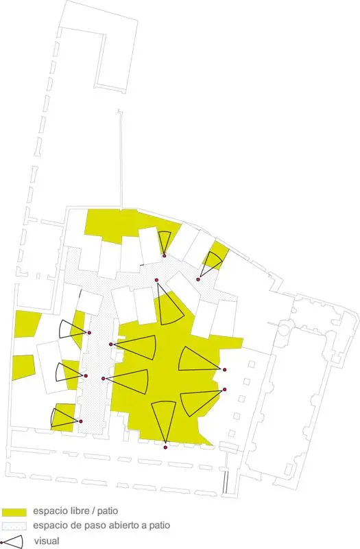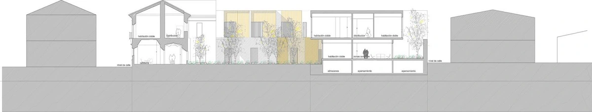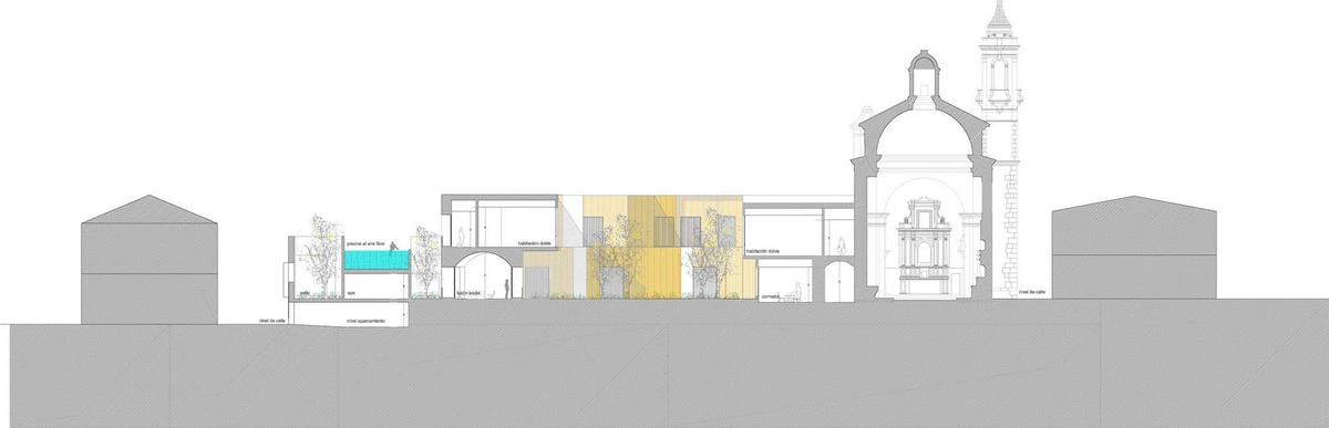 Las habitaciones más próximas a la iglesia toman como distribuidor su nave lateral, mientras que las estancias adaptadas se sitúan en el edificio preexistente, facilitando su accesibilidad.