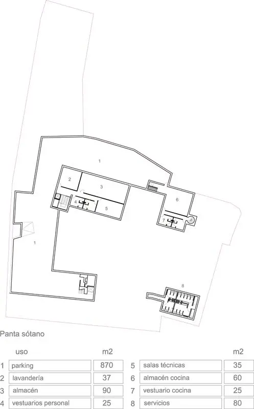 Mención aparte merece el aprovechamiento de la antigua iglesia. El comedor del restaurante se sitúa paralelo a la nave y se abre al espacio arbolado con un cerramiento que se puede retirar por completo en verano. La cocina se desarrolla siguiendo la línea estructural de la iglesia y alberga amplias áreas de servicio en la planta sótano.