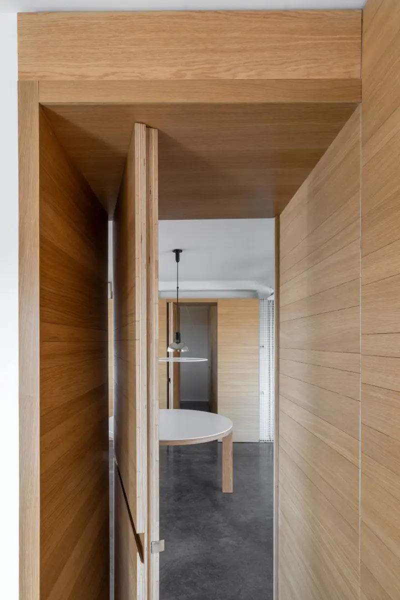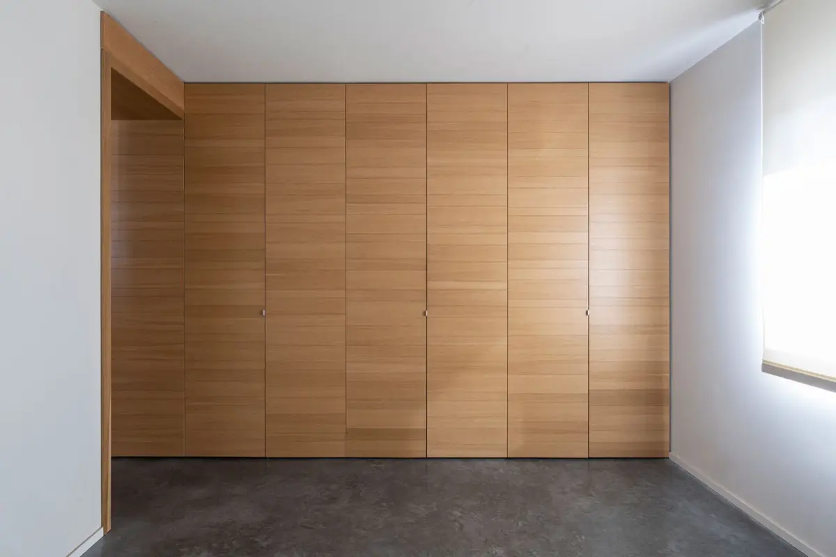 Todos los espacios y elementos que tienen una función concreta (como el baño, los electrodomésticos, etc.) quedan ocultos tras armarios y paneles de suelo a techo, excepto elementos esenciales como iluminación, ventanas, sillas, suelo, paredes y techo. Las texturas de las paredes y su construcción no dejan claro si son paramentos, panelados, puertas, o armarios.