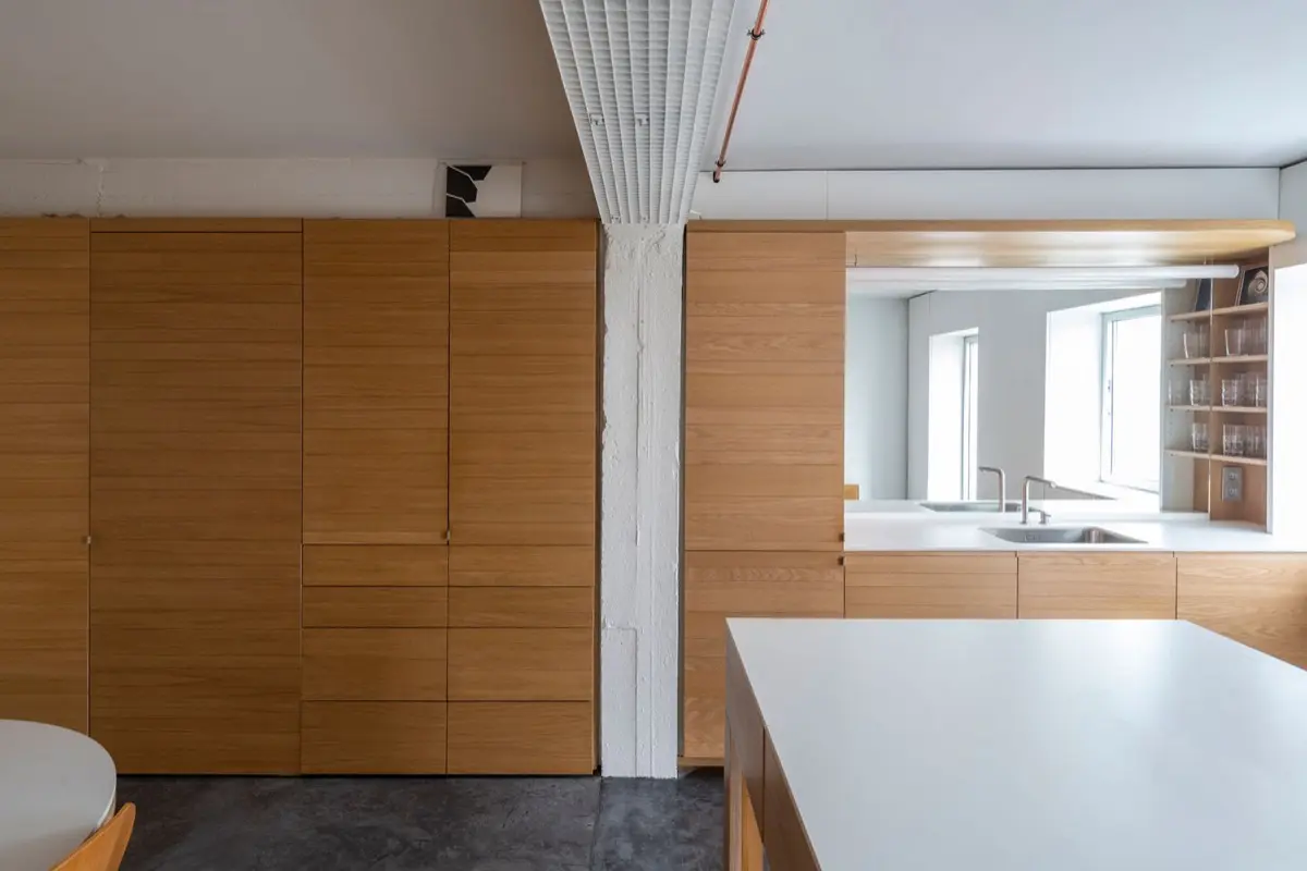 Los espacios inversos a la cruz latina alojan los espacios programados, de uso más fijo, y concebidos como espacios servidores que dan soporte a las funciones que surjan en el espacio libre. También los materiales y el mobiliario se han elegido para contribuir a esa espacialidad y funcionalidad “no binaria”, sino híbrida. Así la duplicidad de usos de algunos elementos, como la isla de cocina que puede usarse como mesa, o escritorio.