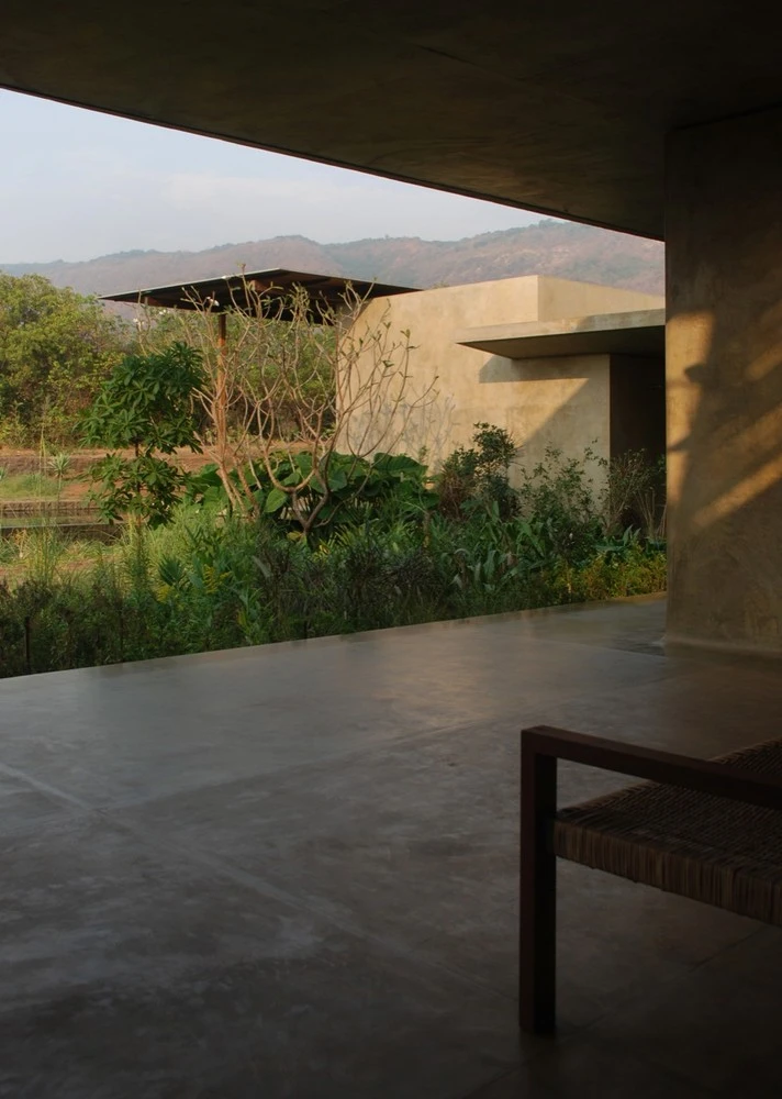 Tanto las paredes como los suelos de hormigón pulido se impregnan de la terrosidad de la finca con su gama de ocres, de forma que las estancias parecen brotar espontáneamente de la parcela. Unas habitaciones con mobiliario espartano rodean la piscina y el patio central, repleto de vegetación.