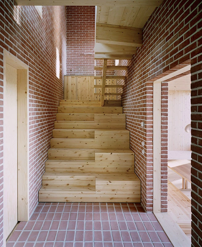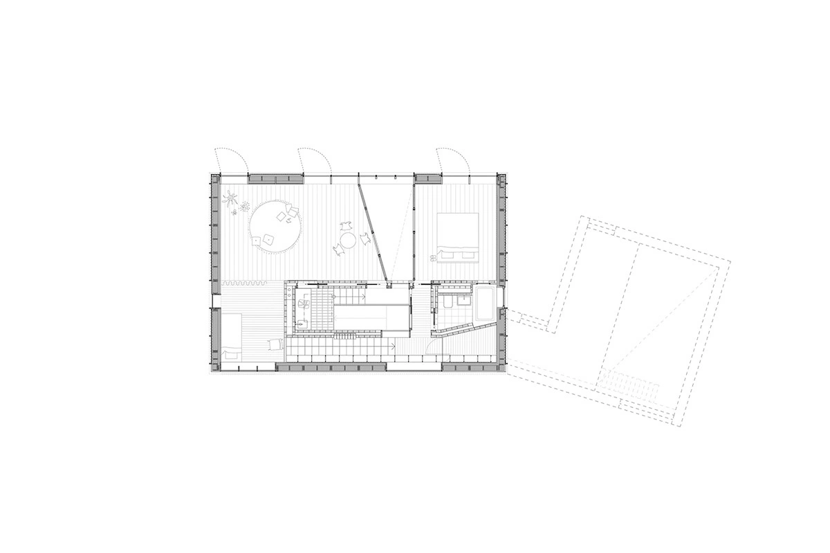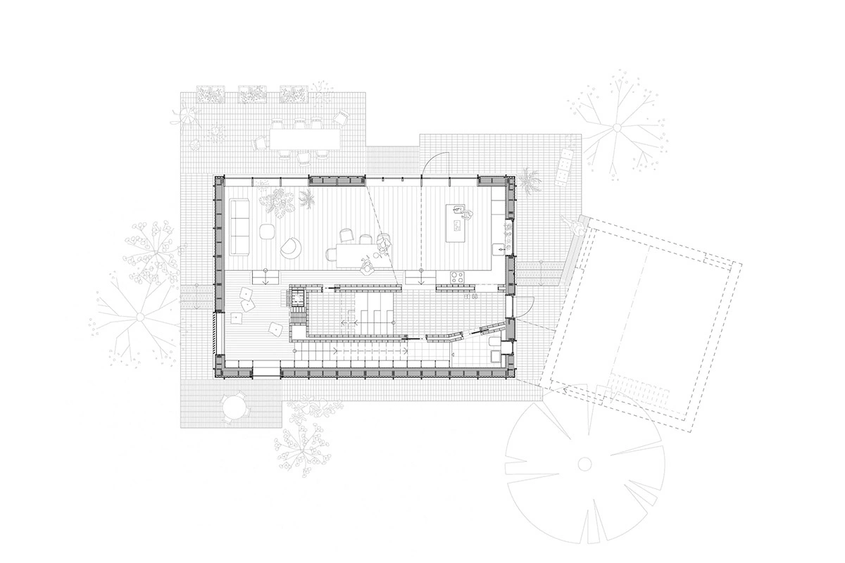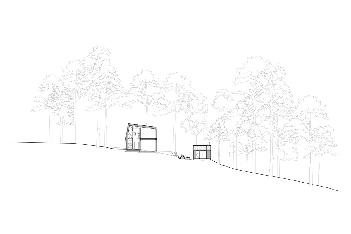 Acotado por el bosque de pinos, el edificio principal se asienta en la zona más alta, desde donde puede contemplarse la casa de invitados y las pequeñas plantaciones rectangulares. En una planificación a largo plazo, también se reservaron áreas para un garaje y un estudio independiente.