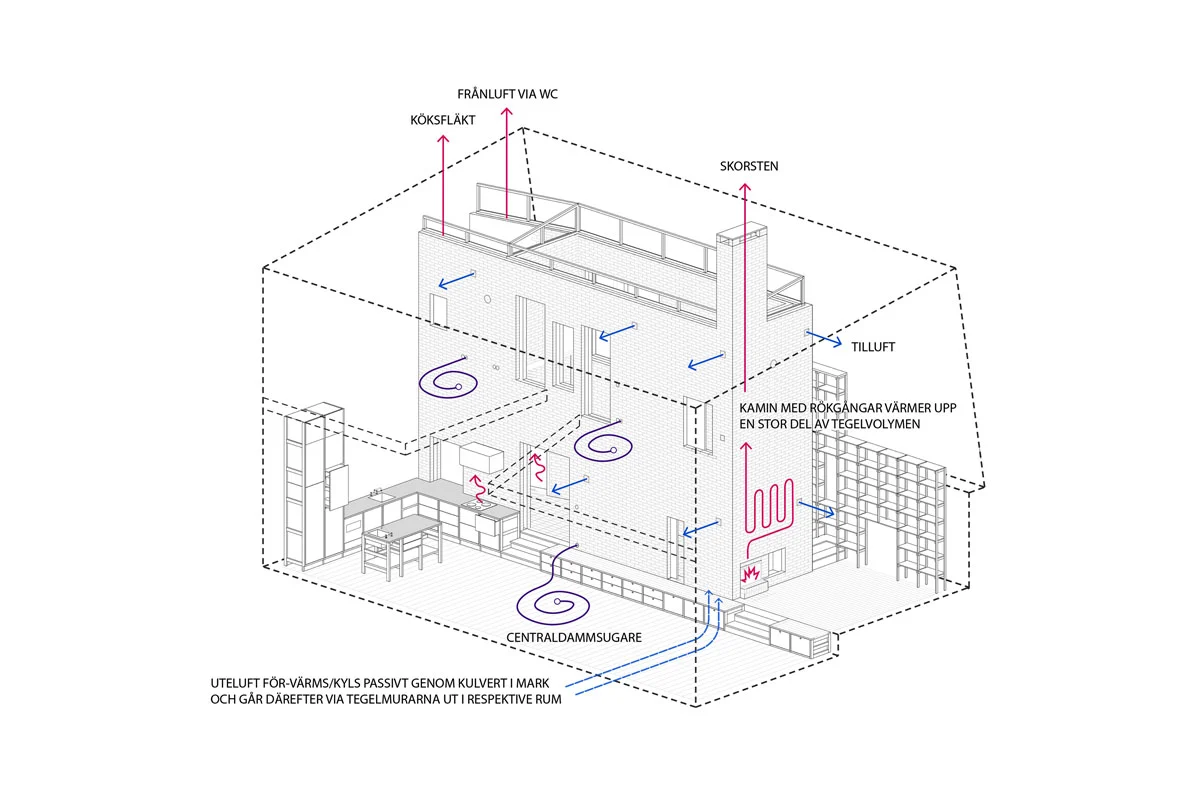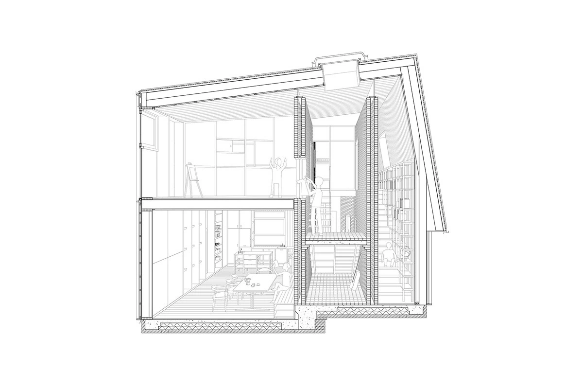 Como elementos constructivos, la madera y el ladrillo rojo son los grandes protagonistas. Así mismo, se realizó un estudio preliminar para encontrar la disposición óptima de la casa en un terreno en pendiente que además iba a ser usado en parte como superficie de cultivo.