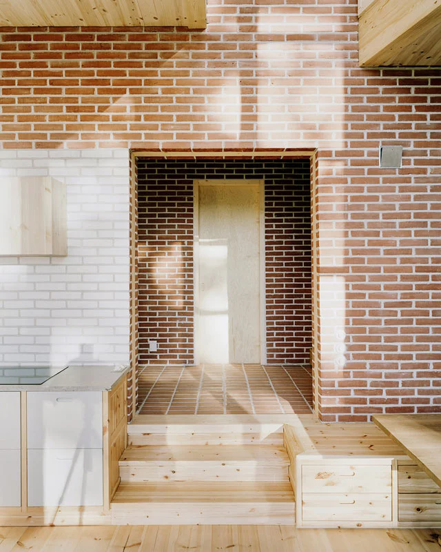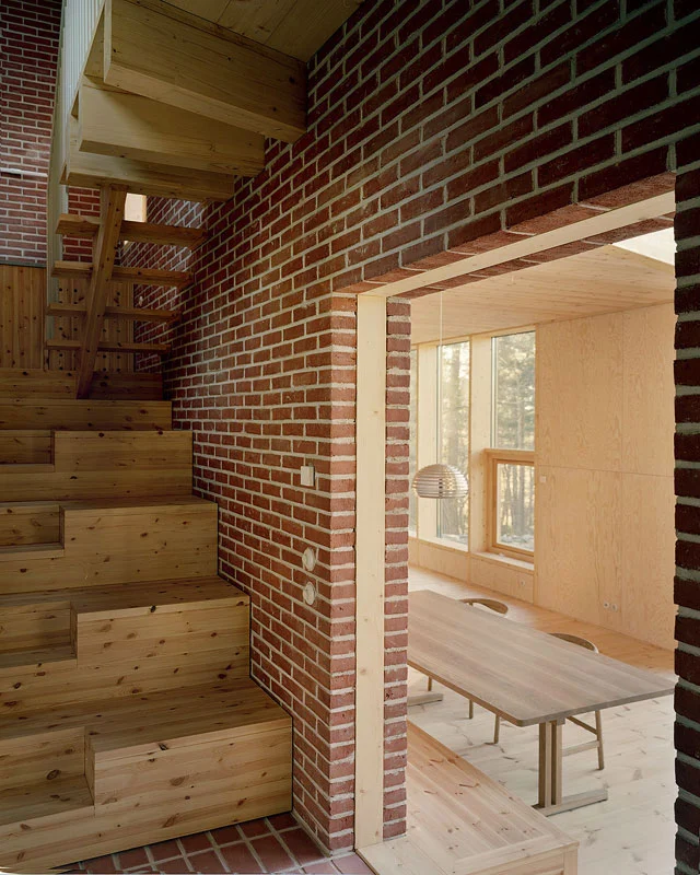 Por su parte, el ladrillo juega su papel delimitando los espacios interiores y creando una gran chimenea con conductos que llevan el calor a la sala de estar, la biblioteca o los dormitorios de la planta superior.
